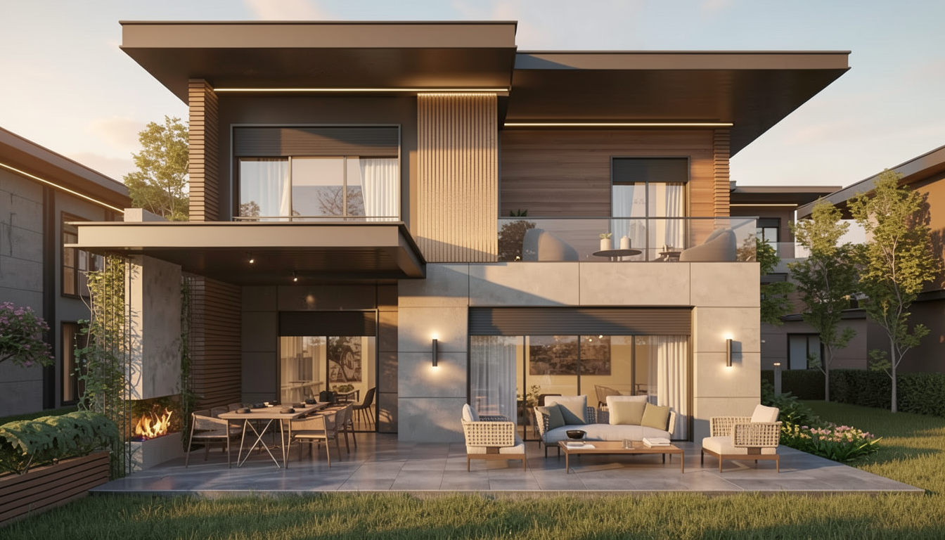 beaux arts exterior shot render a modern suburban house with a bright and inviting atmosphere the house has a classic design with three gables and a two car garage the exterior walls are color and pattern blocked with light and dark colored hardie the roof is a sleek dark charcoal gray black windows with grids do not use brick any where on the house the front steps and entryway are made of light gray stone surround the house with lush green grass and tall mature trees casting soft shadows the sky is clear with a gradient from azure to soft pink as if it s early evening architecture