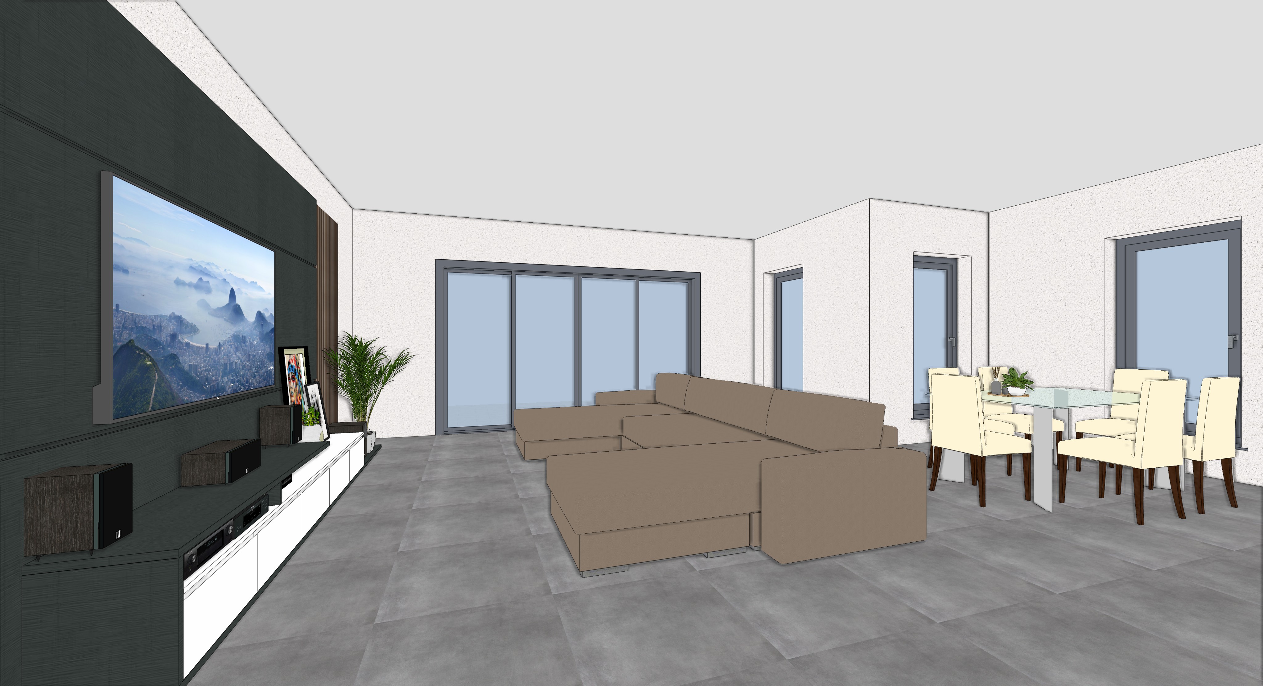modern livingroom trees and lawn oht the outside of the windows softly daylight