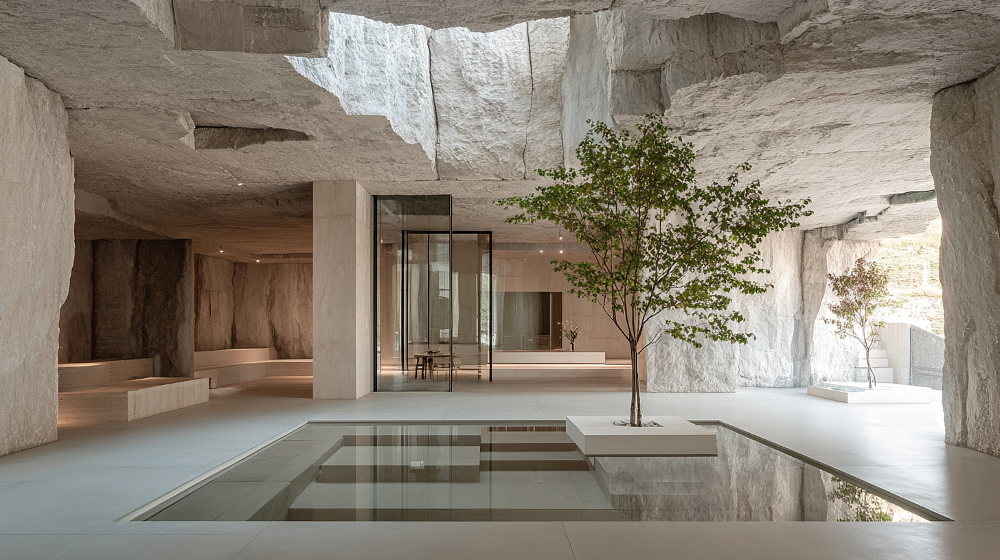 render an open underground space carved out of natural stone the stone walls and ceiling have an earthy grey and beige texture with subtle roughness there is a sense of tranquility and minimalism large glass doors create a transparent division between sections place indoor greenery with lush green leaves bringing a touch of nature inside the floor is smooth and light grey reflecting light subtly a central water feature adds calmness with clear reflective water use soft ambient lighting to highlight the natural textures and create a warm inviting atmosphere architecture