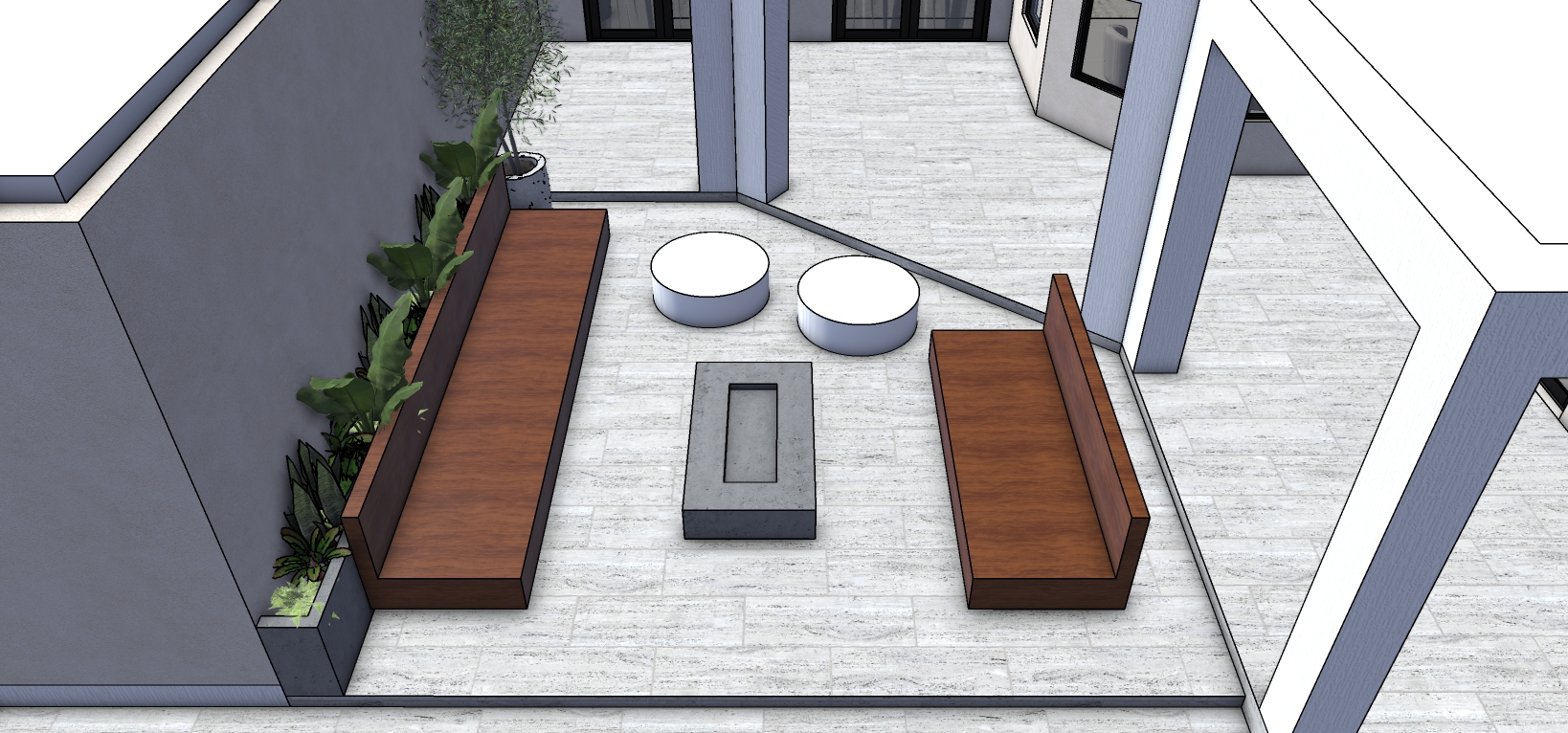 transform this image into a highly realistic modern outdoor patio render preserving the original architecture proportions and camera angles architecture finishes keep all patio walls and columns in stucco white clean and uniform without changing their color texture or geometry fire pit add black lava stones inside the fire pit and introduce realistic natural flames in the center the fire should look subtle and elegant not exaggerated bench seating add outdoor cushions to both wooden bench sofas on each side use light neutral fabric off white sand beige realistic outdoor textile with soft folds and natural wear integrated lighting add recessed led lighting underneath both bench sofas and underneath the fire pit creating a floating effect use warm light at 2500k very soft indirect and not too intense round seats replace the two round seats with modern woven wicker poufs natural tone suitable for outdoor use cohesive with the patio design plants replace the background plants with modern varied landscaping avoiding repetition use a mix of contemporary outdoor plants that complement a minimalist luxury patio overall look ultra realistic materials accurate shadows natural reflections soft ambient lighting modern luxury outdoor atmosphere