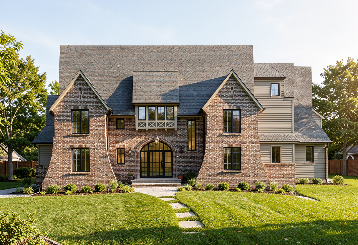 design this house with brown red brick on the front and charcoal lap siding