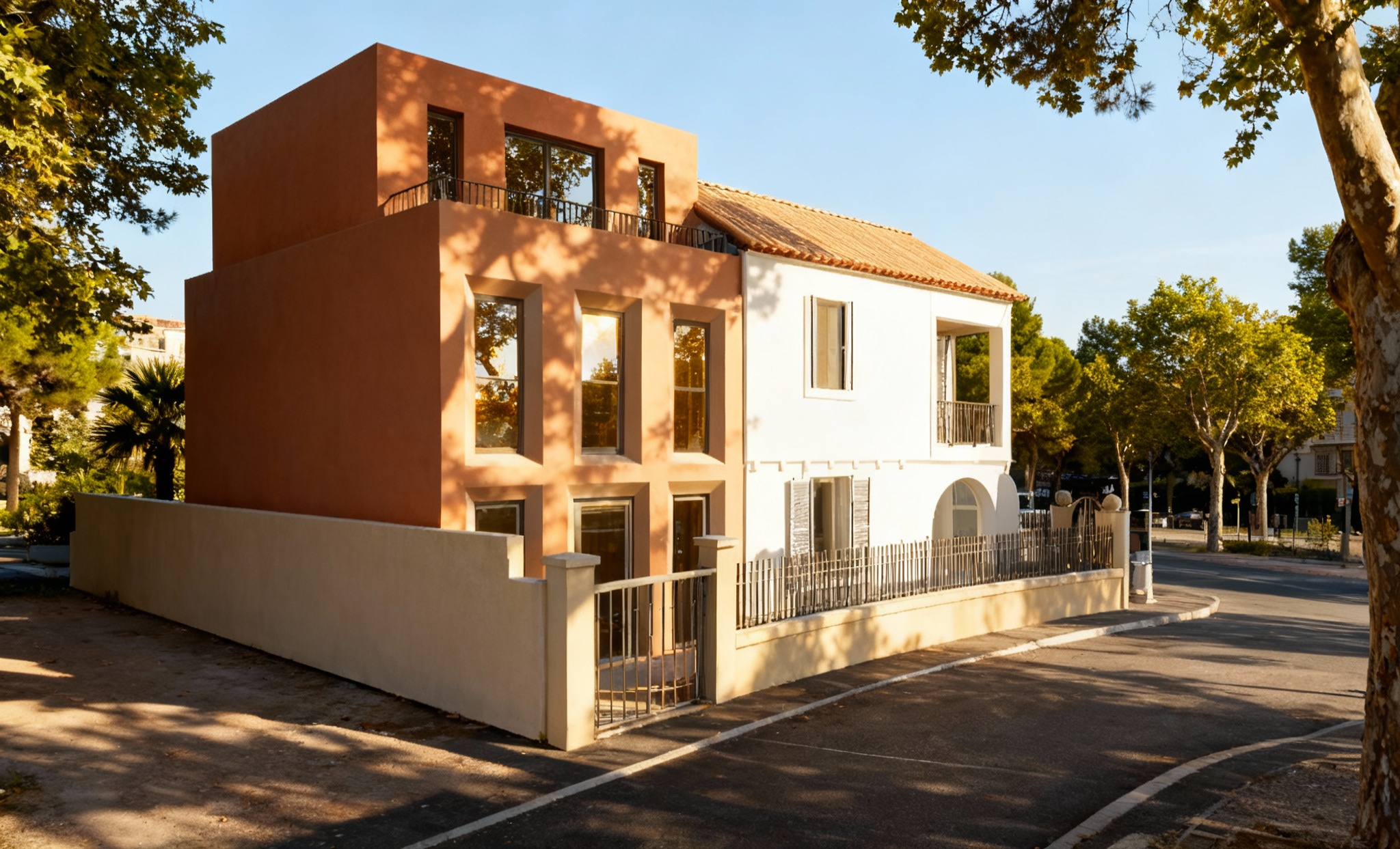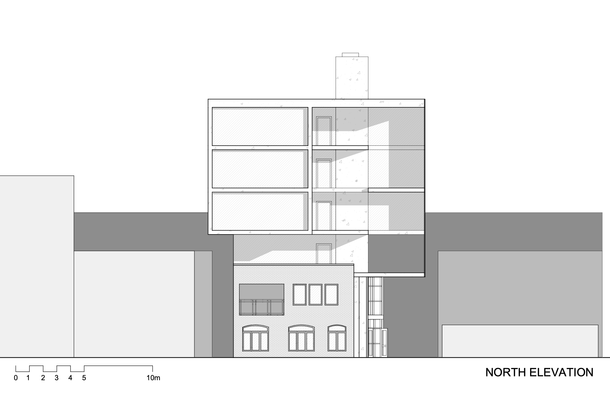 using this rendered elevation as the base keep the central building exactly as shown red brick lower levels floating glass volumes above and light cement structural framing do not alter the building geometry now integrate a subtle community gathering space to the right side of the building behind the entrance area this zone should suggest connection welcoming and social interaction without overwhelming the architecture include elements such as soft greenery planters with small shrubs a few benches or minimal seating and a small sculptural fountain or water feature keep these elements lightly abstracted and consistent with the presentation style clean lines muted colours soft shadows the surrounding buildings should remain muted silhouettes to emphasize urban density while the community space introduces warmth and life use diffuse daylight to create gentle shadowing and reinforce the inviting atmosphere the final composition should feel balanced architectural clarity in the building subtle vibrancy and community activation to the right