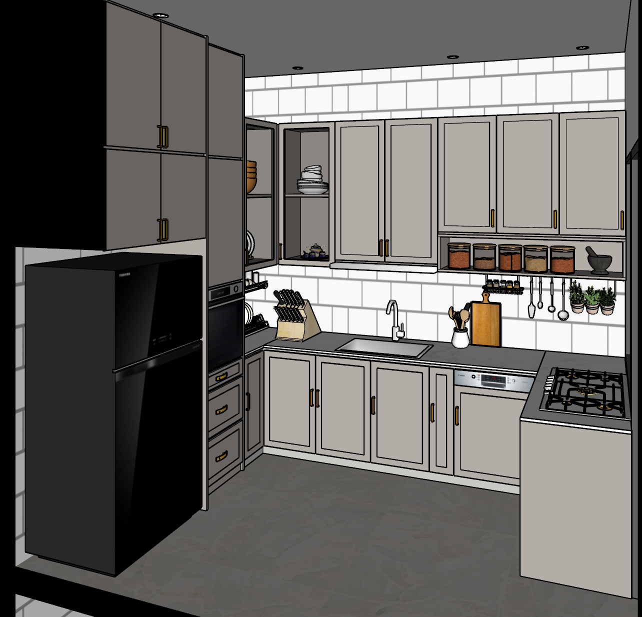 warm kitchen with a lighter grey oak white marble countertops glossy white brick wall do not add rug there will be hood above the water tap but no need to be too obvious image must be16 9 aspect ratio on a sunny day make sure that the dish washer must be obvious