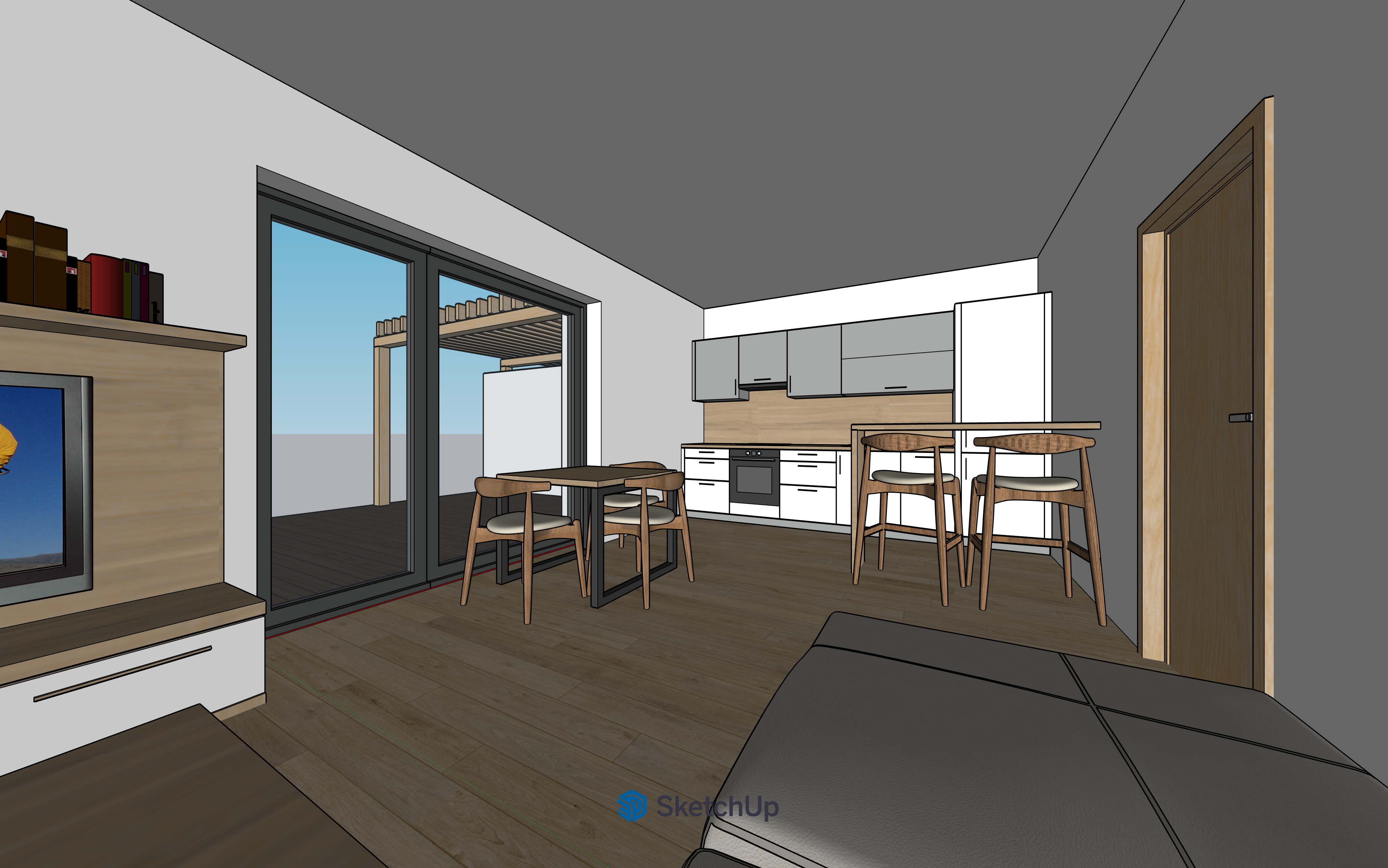 interior shot modern interior design open living room and kitchen stylish conference and minimalist furniture wooden table with black metal base and dining set anthracite gray sofa light oak floor with slight emphasis on floor slats large glass doors with subtle blue reflections white walls and ceiling warm ambient lighting soft shadows books on a wooden shelf realistic texture on the tv screen display of a vivid natural scenery in the background a dining table with a black metal base and a bar table both with wooden chairs at the back a kitchen with white glossy doors a 5 cm wide dividing strip on the sides next to the stove 3 drawers on both sides shallow at the top deep at the bottom gray upper cabinets next to the tall cabinet a wide cabinet with flap doors above the stove a cabinet with a strip hood between the upper and lower cabinets the wall is covered with a wooden board in an oak pattern the worktop in the same pattern