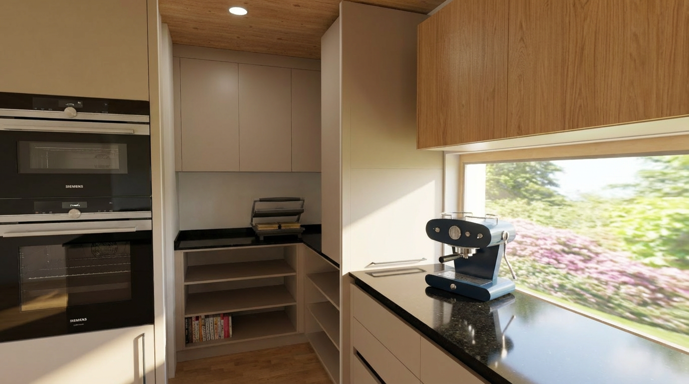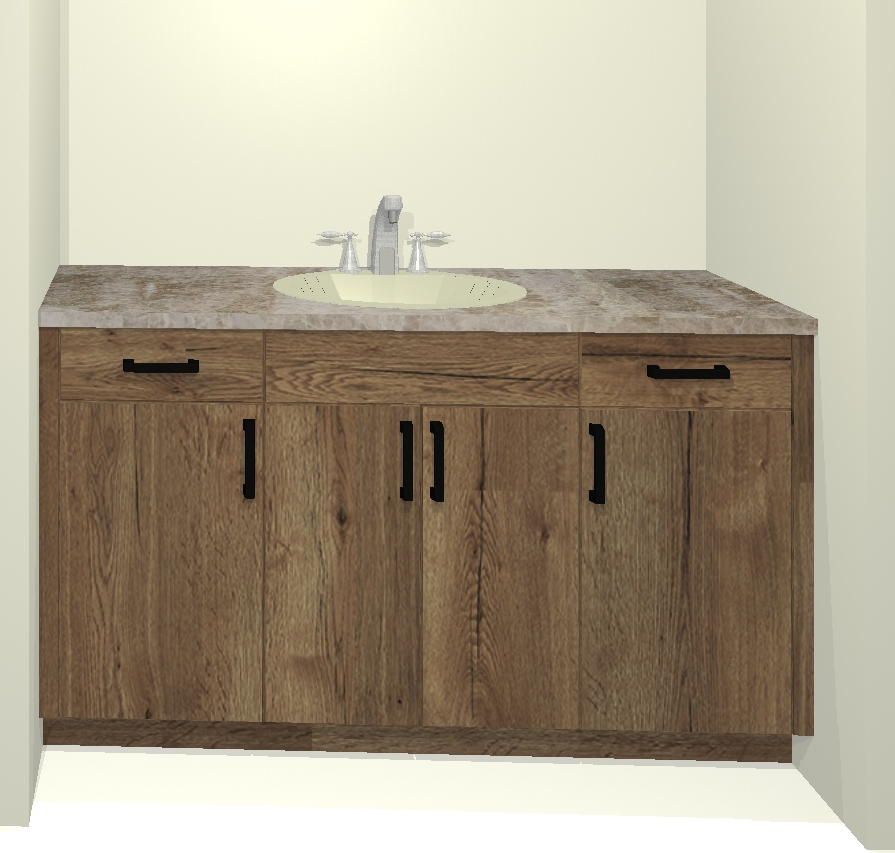 render a modern bathroom vanity with a natural inviting atmosphere the vanity should have rich oak wood texture warm and earthy brown tones and sleek black handles the countertop is a polished granite with shades of gray and subtle white veining the sink is a soft ivory color with a black faucet for a touch of elegance set against a light cream wall the overall scene should be softly lit with ambient cozy lighting creating a serene and stylish space a mirror on the wall beneath a modern vanity light