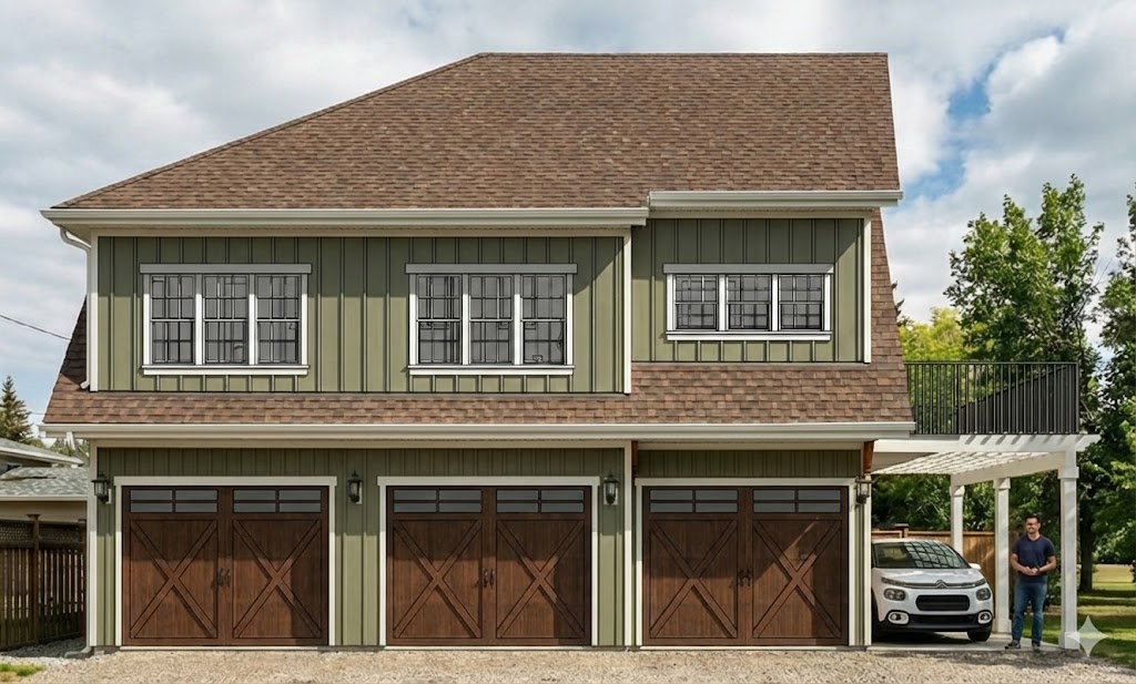 exterior shot using the reference image s render style background placement camera angle distance to the viewer colour pallette camera framing etc i want you to render the input image elevation with all its shown materials brick door styles trimwork window sizes window styles rooflines details in exact proportion to the reference image same time of day same shadows
