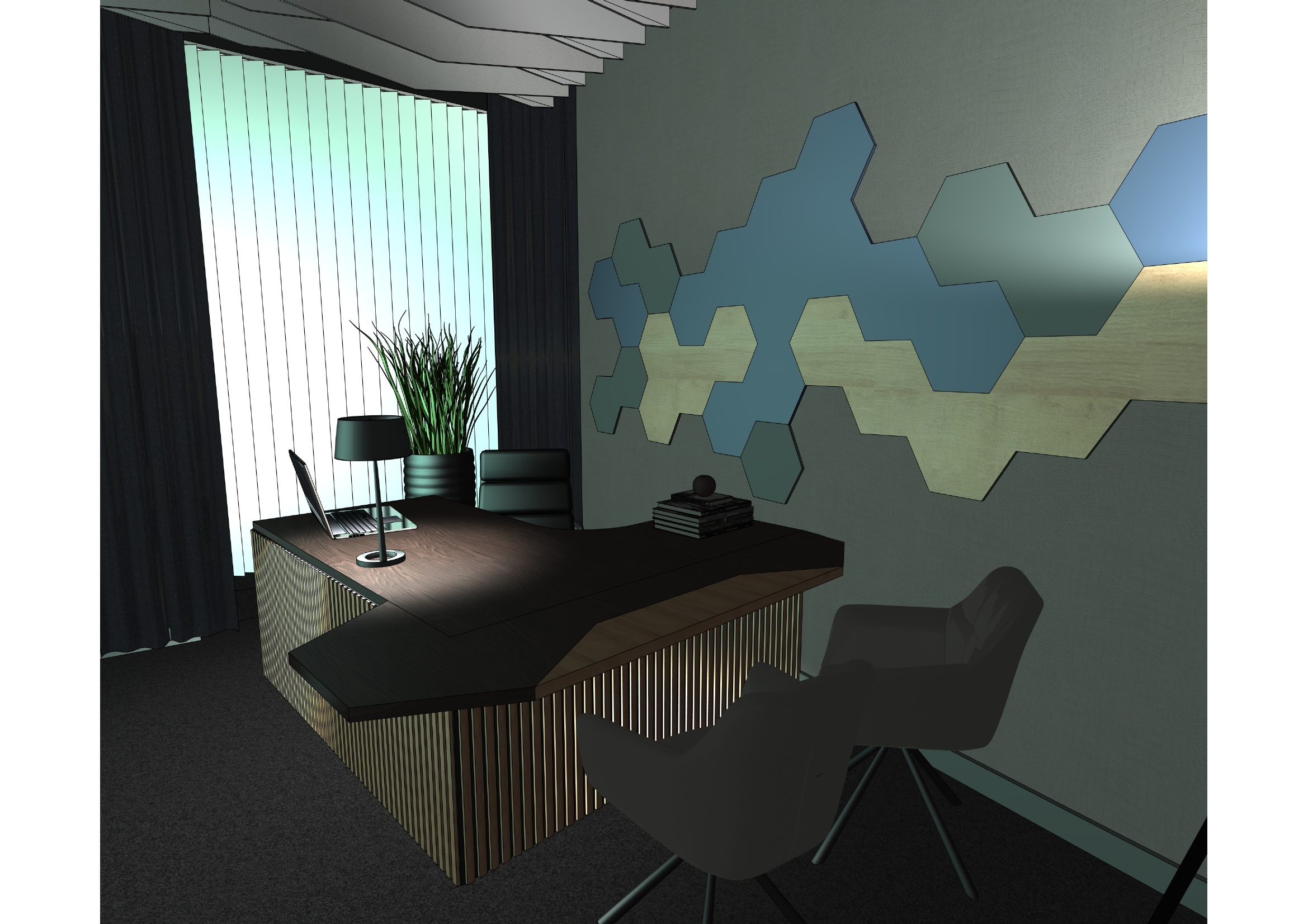 ultra realistic interior night visualization based exactly on the provided reference image strict preservation mode absolute preserve 100 camera angle perspective framing object placement and proportions materials colors and design no changes allowed no additions no redesign lighting night scene critical simulate realistic night interior lighting with mixed light sources primary light desk lamp main light source warm white tone 3000 3500k soft localized illumination cone on desk surface realistic falloff strong near lamp fading naturally secondary light exterior ambient light through blinds cool tone 4000 5000k very soft diffused slight bluish tint allowed but very subtle balance warm interior vs cool exterior contrast no color contamination no green yellow shift keep natural white balance shadows strong but soft edged shadows from desk lamp layered shadowing sharpest near objects softer with distance realistic occlusion under desk edges between slats under objects books lamp laptop material response to night light wood desk deeper contrast in grain slightly richer tone under warm light soft specular highlights not glossy wood slats strong vertical shadow rhythm subtle light penetration between slats hexagon wall matte surfaces absorb most light very soft gradient from lamp direction no reflections wall minimal reflectivity smooth light falloff fabrics curtains absorb light darker appearance very soft texture visibility carpet almost no reflection deep soft shadow absorption micro realism subtle noise grain 1 2 slight uneven light distribution avoid cg perfection micro roughness variation on all surfaces reflections extremely controlled soft and blurred only no artificial shine exposure camera slightly underexposed overall night realism preserve highlight detail on desk shadows remain readable not crushed simulate real camera subtle vignette very minimal natural contrast roll off atmosphere calm intimate night office mood realistic light depth strong sense of volume and shadow output ultra photorealistic night render cinematic but still physically believable no stylization no artistic filters resolution 4k 8k ultra realistic night render refinement based exactly on the current image strict preservation mode keep everything identical camera composition framing all objects materials layout lighting concept warm lamp cool window no design changes only realism enhancement lighting correction primary fix desk lamp reduce intensity by 10 15 eliminate hotspot overexposure on lamp shade soften light cone more natural gradient falloff avoid perfectly circular light shape desk illumination introduce subtle light variation break uniformity slightly reduce specular highlight on wood surface window light keep cool tone but reduce intensity slightly add subtle atmospheric softness very light haze avoid overly sharp contrast through blinds shadow improvement strengthen contact shadows ambient occlusion under lamp base books desk edges chair legs introduce layered shadow softness tighter near objects softer with distance add micro shadow irregularity avoid perfect smoothness material enhancement wood desk add subtle roughness variation non uniform reflections slightly reduce highlight intensity on edges introduce micro tonal variation in grain wood slats enhance depth between slats slightly increase shadow contrast inside gaps wall add very subtle bump normal texture improve grazing light response soft light gradient across surface hexagon panels introduce minimal tonal variation 2 3 differentiate materials wood slightly more reflective colored panels more matte chairs slightly lift shadow detail avoid full black add soft rim light from window side reflection control keep reflections soft and blurred remove any artificial gloss feel ensure physically correct roughness behavior micro realism add subtle film grain 1 2 introduce minimal surface imperfections wood slight variation wall micro unevenness avoid cg perfect surfaces camera final look slight vignette 2 3 very subtle gentle highlight roll off preserve shadow detail no crushed blacks result goal photorealistic night interior natural light behavior tactile material depth eliminate cg artifacts keep original mood intact resolution 4k 8k