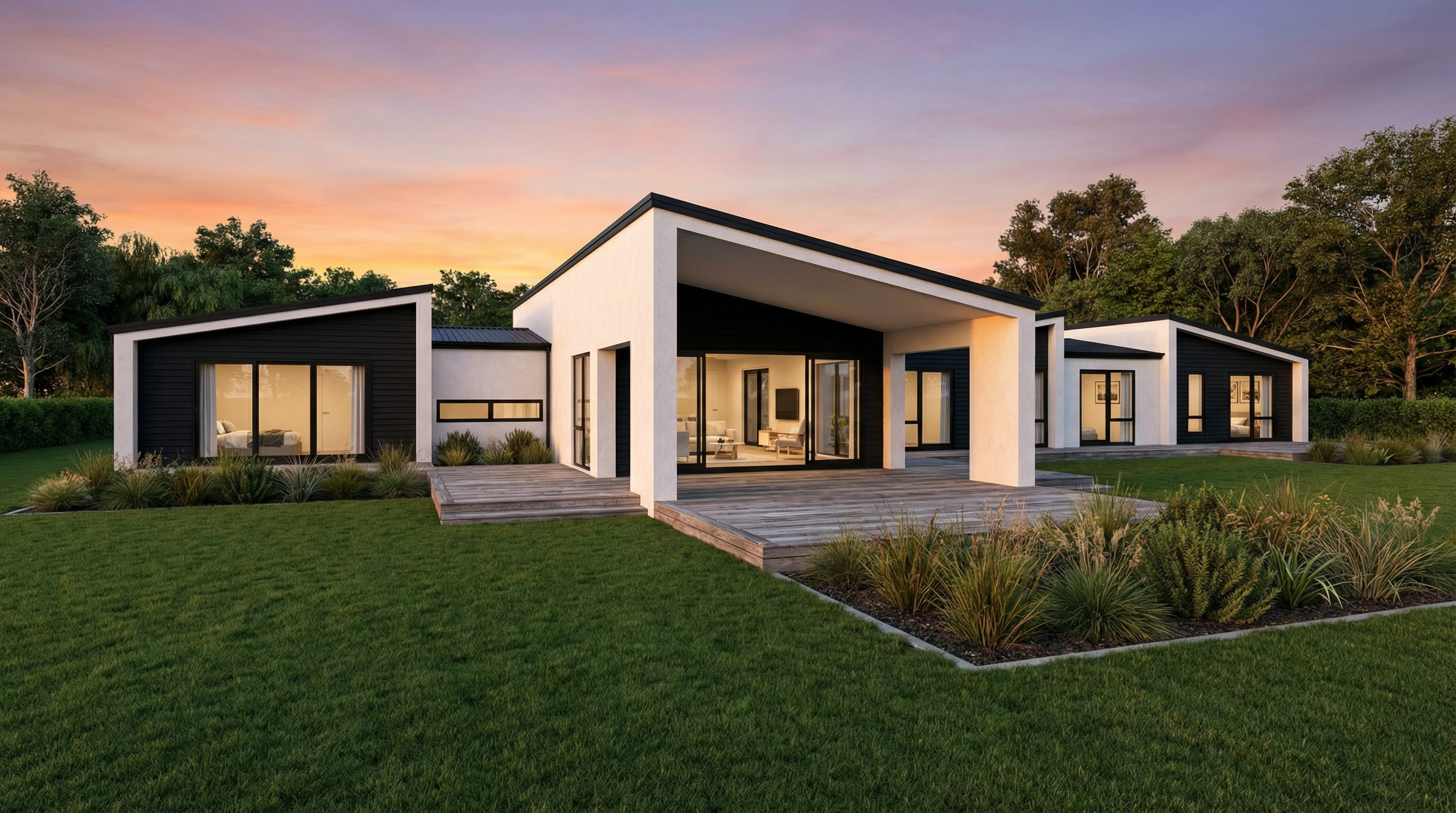 pan right white plaster cladding with black weatherboard features black roof black window frames lawn low timber deck extensive native planting background trees sunset