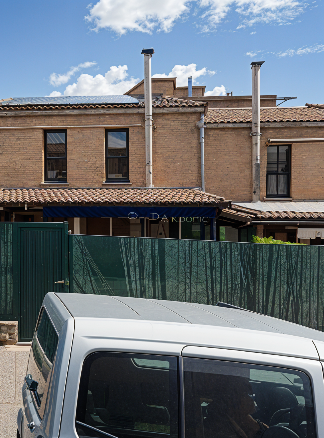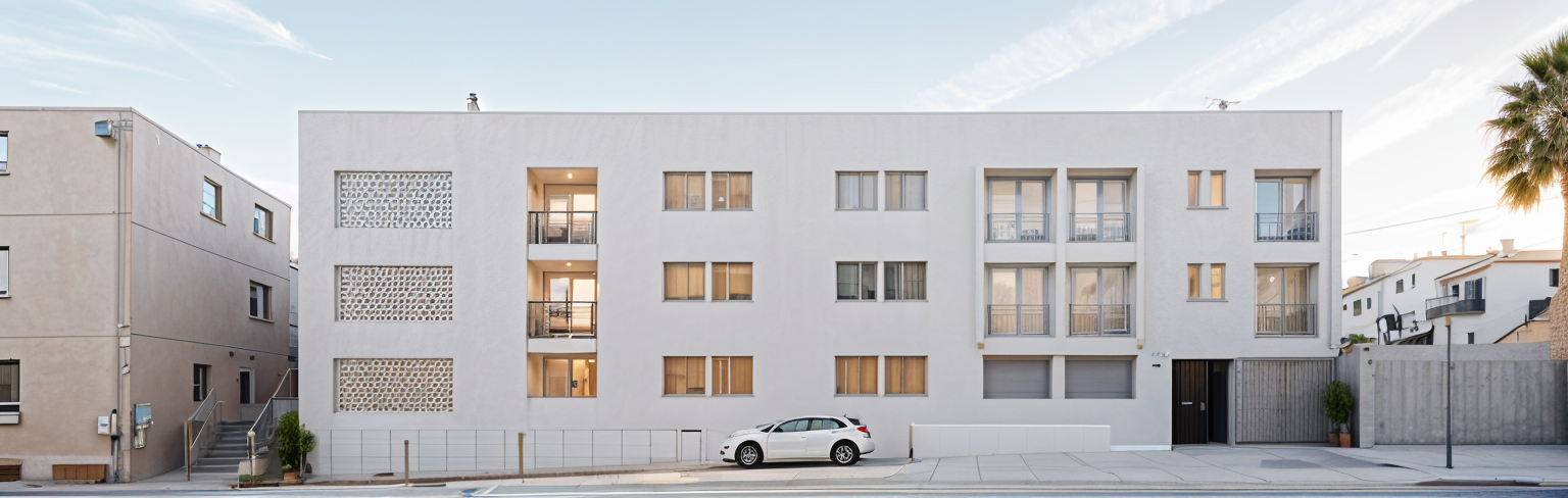 a beautifully detailed suburban house with a warm inviting atmosphere the main house features classical architecture with two stories large windows and a gabled roof the brick facade should be a combination of warm terracotta and cream tones while the roof is a soft charcoal gray the smaller adjacent building is a modern guest house with a clean white exterior and sleek black roof surround the property with lush greenery tall vibrant green trees and neatly manicured lawns add a splash of color with blooming red flowers in the foreground the driveway is a smooth asphalt gray leading to the garage doors the sky is a clear soft gradient of pale blue to light gray suggesting a calm early evening ambiance architecture