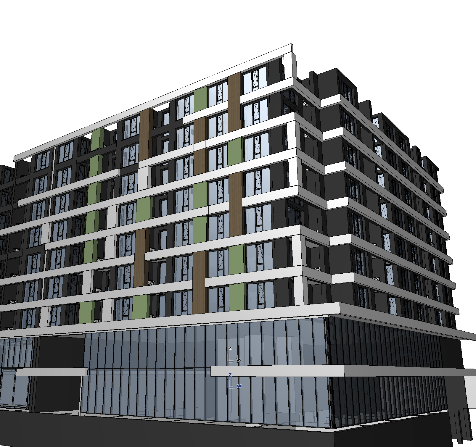 minimalism exterior shot a modern architectural rendering of a multi story building with a sleek contemporary design the building features alternating panels of dark gray and rich brown for a sophisticated look complemented by accents of fresh green large windows with a reflective glass finish add a sense of openness and lightness the lower facade showcases a series of tall black framed windows the setting is a clear sunny day with a vibrant blue sky casting soft shadows on the building the atmosphere is lively and modern highlighting urban sophistication and innovative design architecture