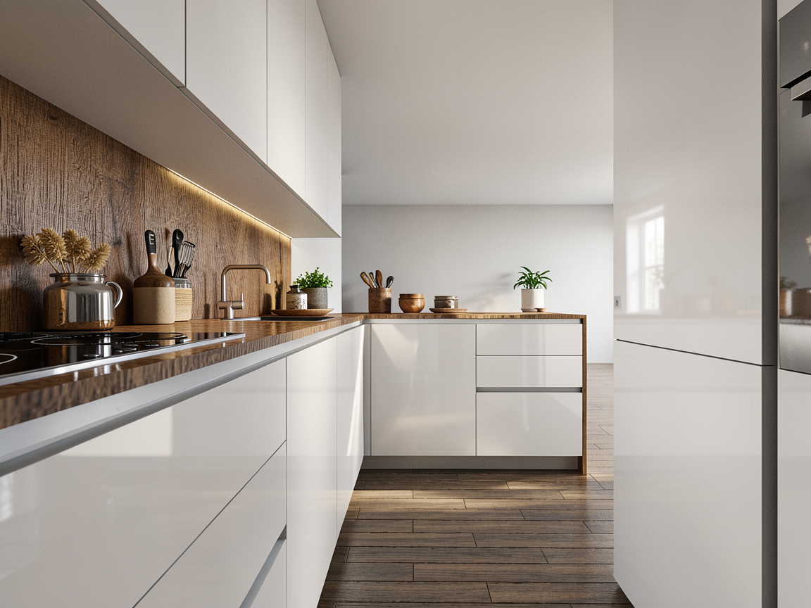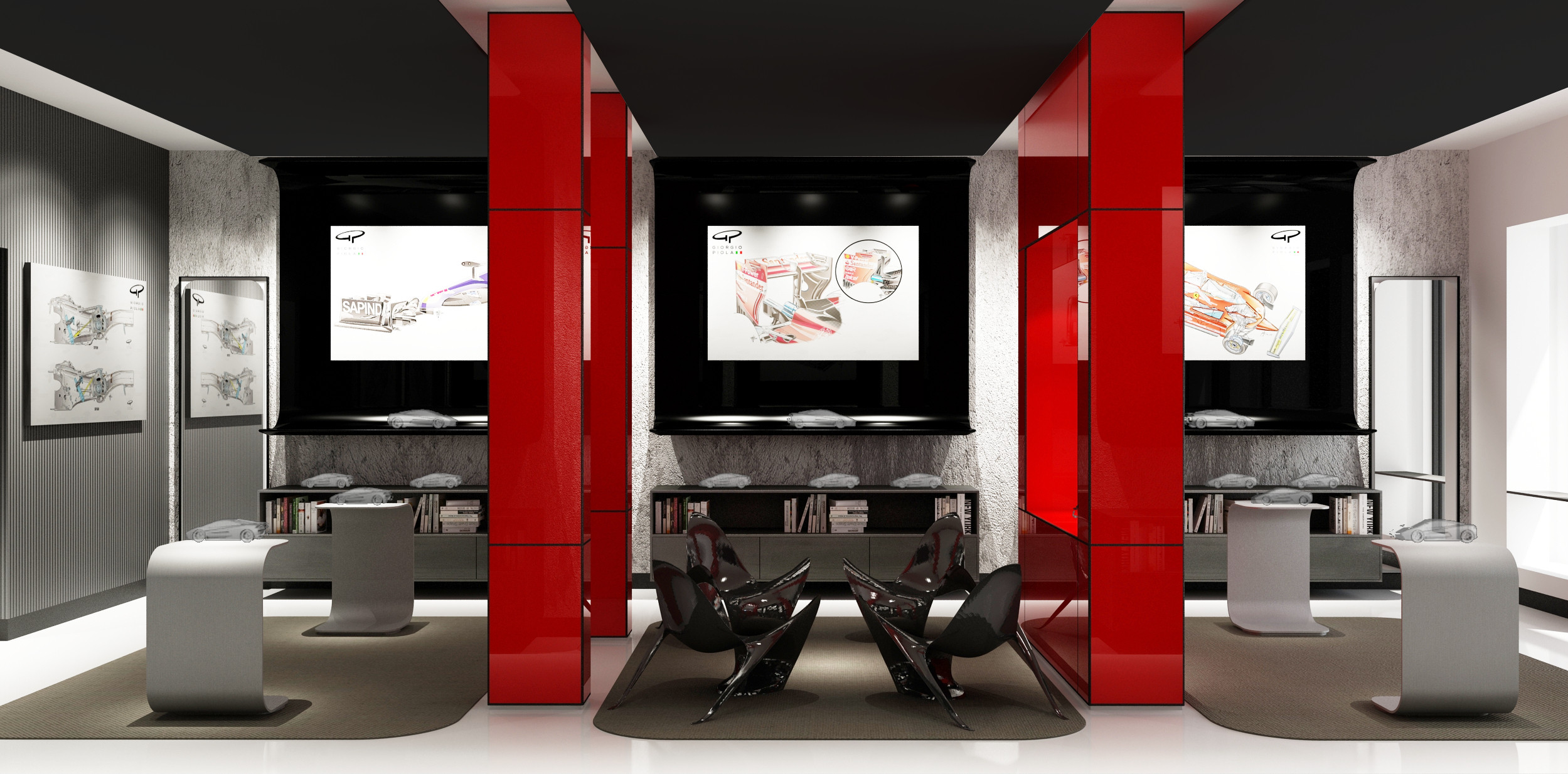 ultra modern automotive showroom interior symmetrical composition luxury minimal design high contrast materials central perspective view with strong axial alignment glossy red lacquer columns dividing space black lacquered feature walls with recessed display niches large illuminated technical automotive drawings posters mounted on back walls matte white sculptural display pedestals with scale car models built in low shelving with books and additional models foreground features futuristic black lacquer high gloss lounge chairs with organic curved forms arranged in a conversational cluster on a soft neutral grey rug floor is polished white concrete reflective but subtle walls combine textured concrete plaster and ribbed dark panels for contrast lighting is soft white architectural hidden led strips under shelf glow ceiling coves and spotlights emphasizing displays clean shadows cinematic mood cooler toned lighting balanced exposure materials are premium glass lacquer metal polished surfaces color palette black white deep red accents neutral greys no people hyper realistic ray traced global illumination sharp reflections 8k detail interior visualization ultra luxurious