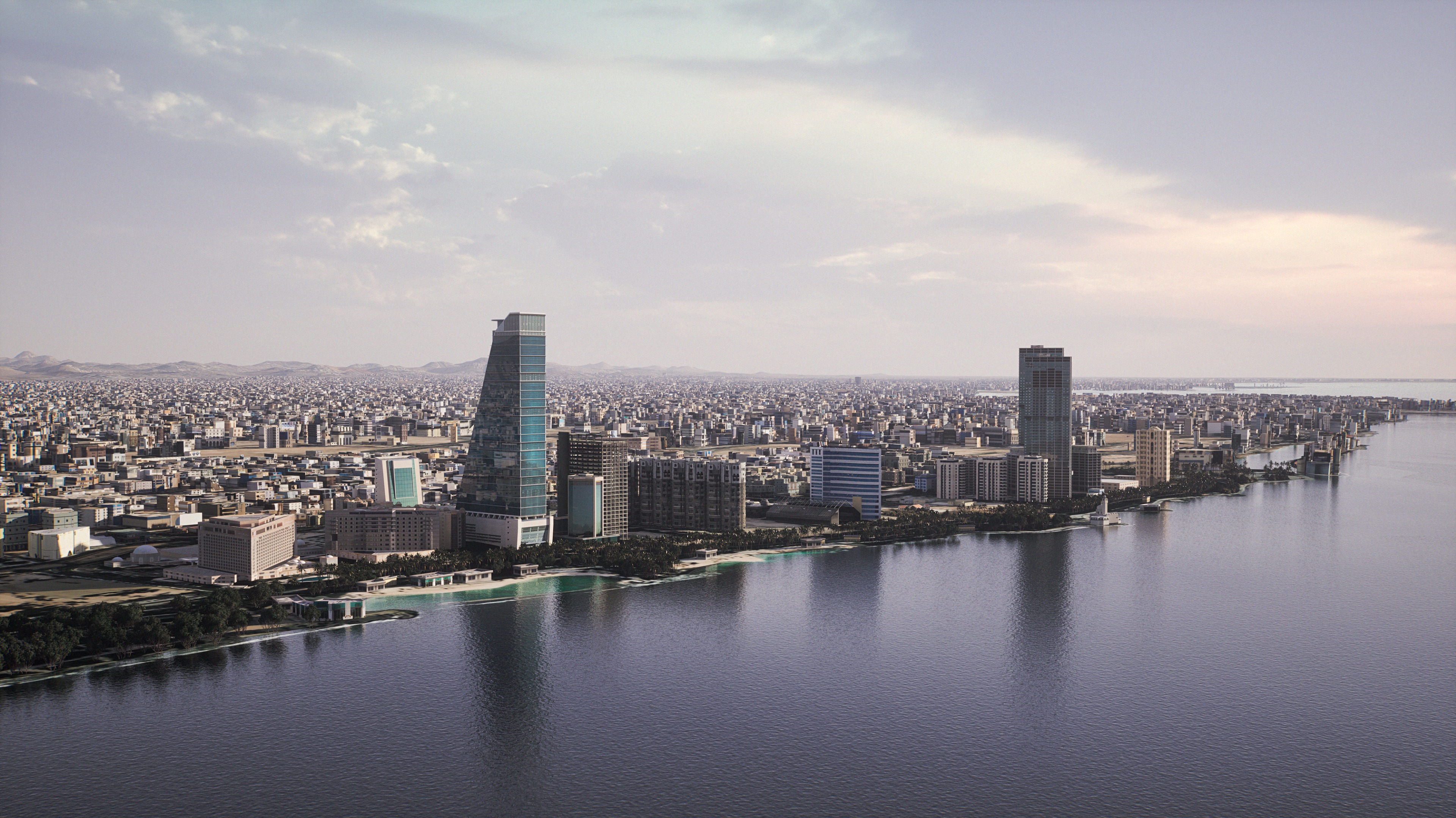 aerial view of a modern coastal city featuring a slightly cloudy afternoon sky warm sunlight dramatic clouds the ocean reflects the sky s hues adding shimmering shades of light blue and turquoise a few small boats can be seen breaking the ocean weave and leaving slight water trails sleek skyscrapers predominantly in glass and steel rise from the shoreline casting detailed reflections on the water the cityscape extends to the horizon with varying shades of grey and slate for the buildings verdant greenery highlighted with deep greens lines the coast providing a refreshing contrast the atmosphere is calm and serene with a gentle breeze suggested by the subtle movement of the clouds and water maintain building design exactly photorealistic drone footage style