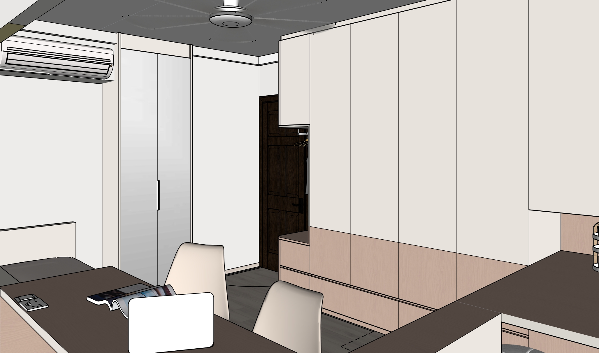 colours to remain accurate as per original given picture wood texture to be subtle drawers and all table top surface in warm beige laminate with a soft blush pink undertone and subtle wood grain texture niche in light beige microcement and only bottom till study table in muted soft pink subtle wood grains top half of carpentry in solid colour light beige and only bottom till study table in muted soft pink subtle wood grains 2 doors full height cabinet in mirror recessed 150mm height skirting ontop ceiling in off white bed headboard in solid colour light beige floor in muted light beige vinyl subtle grains ceiling fan in white walls in off white sunlight coming in from the right side of room socket switch in white edge of wardrobe to be curved