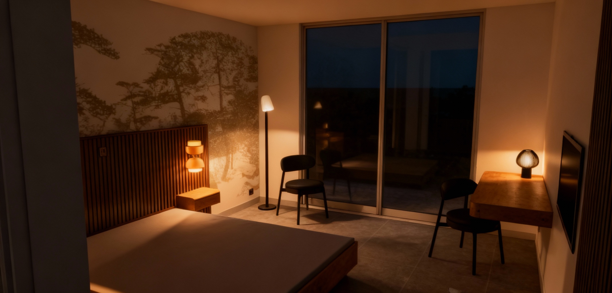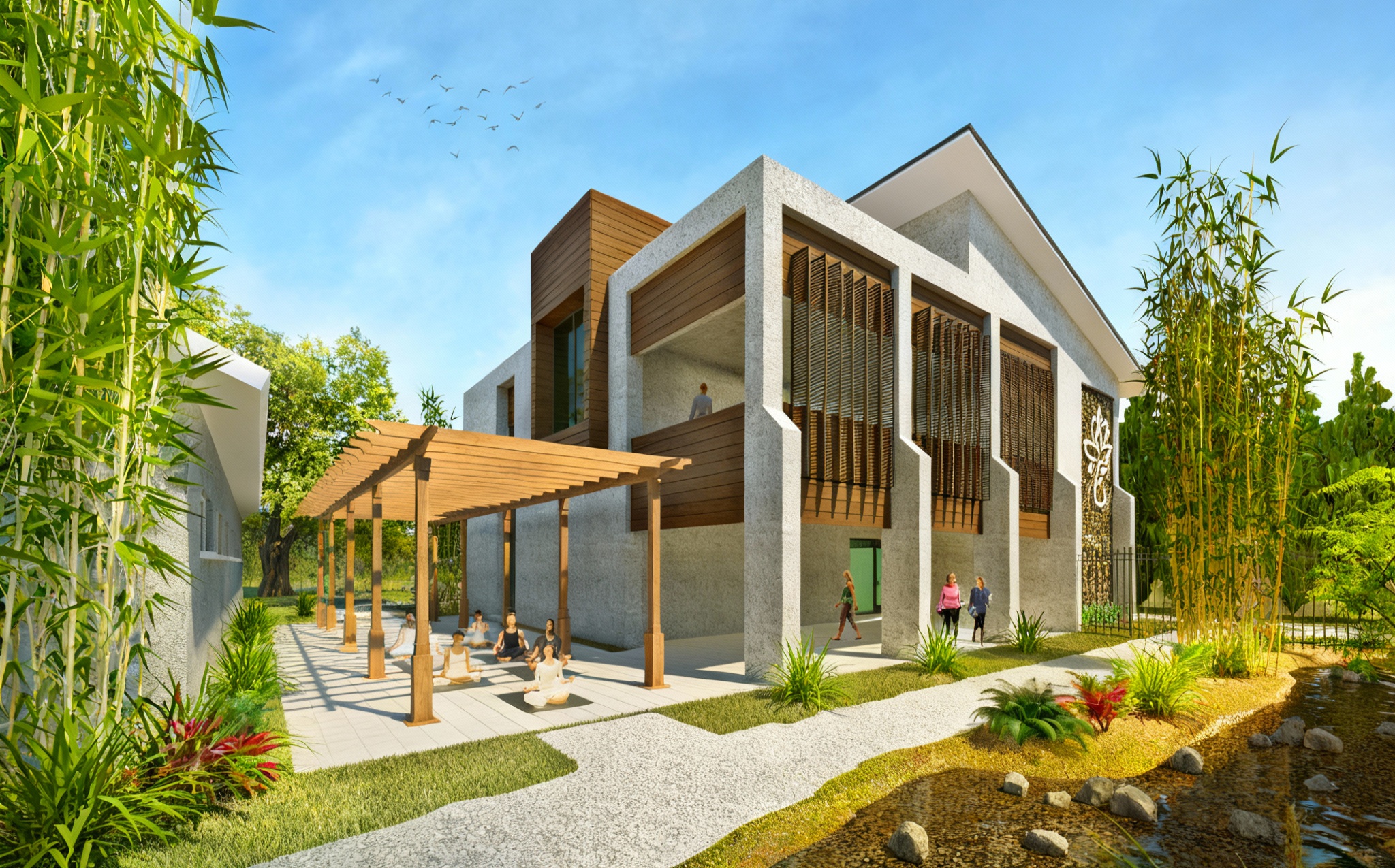 add tropical landscaping around building rocky creek in bottom right corner crushes shell path next to creek blue sky front lighting mid day sky