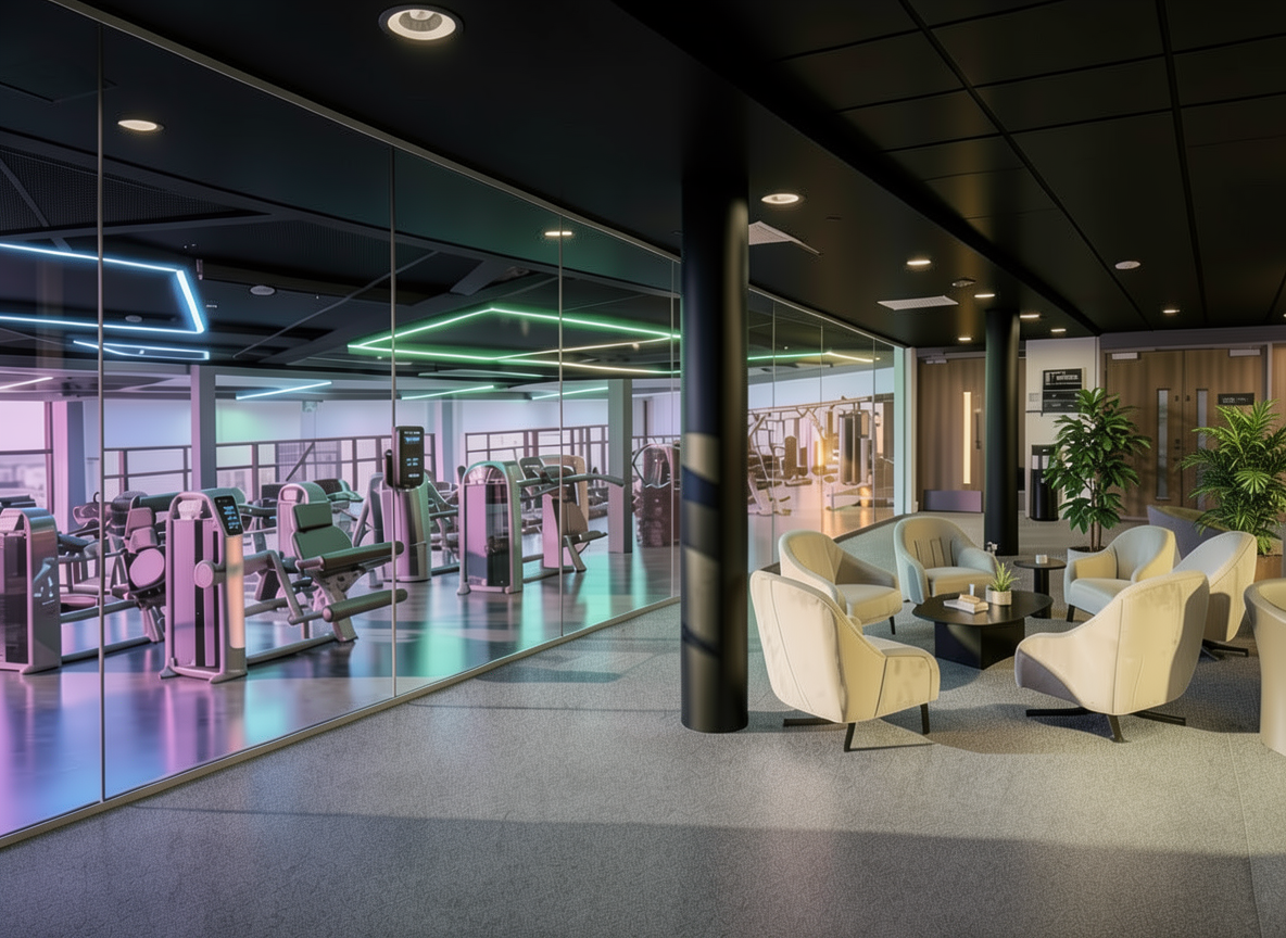 keep the existing composition materials furniture flooring columns ceiling lighting and plant placement completely unchanged add a small number of people to subtly activate the scene a few people using gym equipment behind the glass wall on the left some casually walking through the lounge or approaching seating areas on the right and a few seated naturally in the lounge area ensure all people are realistic in scale relative to furniture columns ceiling height and gym equipment apply subtle motion blur to people who are walking or using gym equipment to convey movement as if the image were captured in a time lapse photograph seated people should remain sharp people should wear appropriate clothing gym attire for the gym casual modern clothing for the lounge with varied postures integrate them naturally with soft shadows and subtle reflections on polished surfaces without overcrowding maintain ultra realistic rendering high detail modern luxury interior and cinematic architectural visualization do not alter any furniture carpet gym equipment or structural elements
