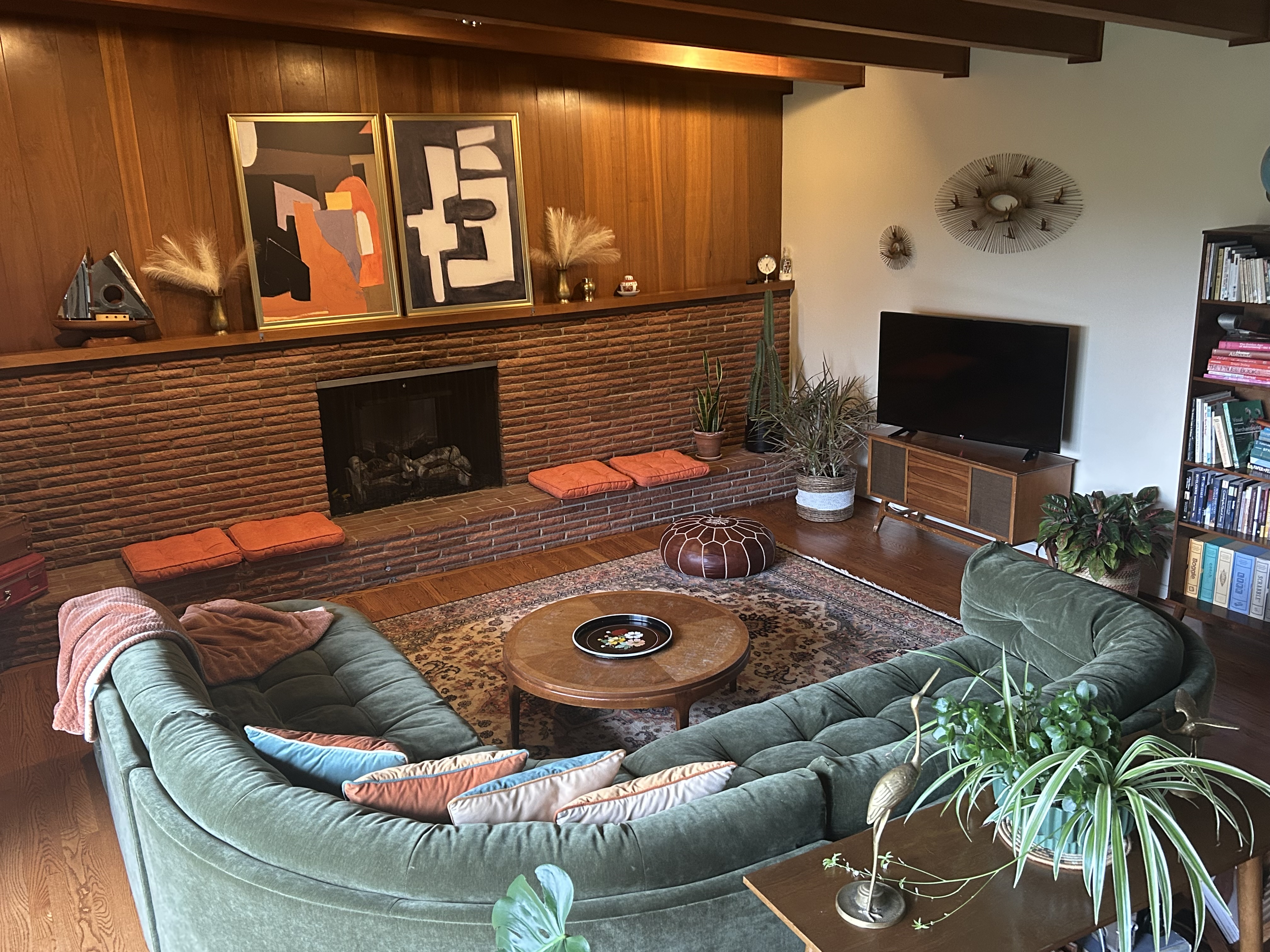 enhance this midcentury living room by improving the lighting with warm ambient illumination and subtle directional spotlights to highlight architectural details maintain the original furniture layout color palette and design elements increase color contrast and depth while preserving the vintage character add tasteful modern accents such as a sculptural floor lamp textured throw pillows and subtle metallic decor to elevate the aesthetic without disrupting the midcentury feel add light surface texture to walls or woodwork for realism