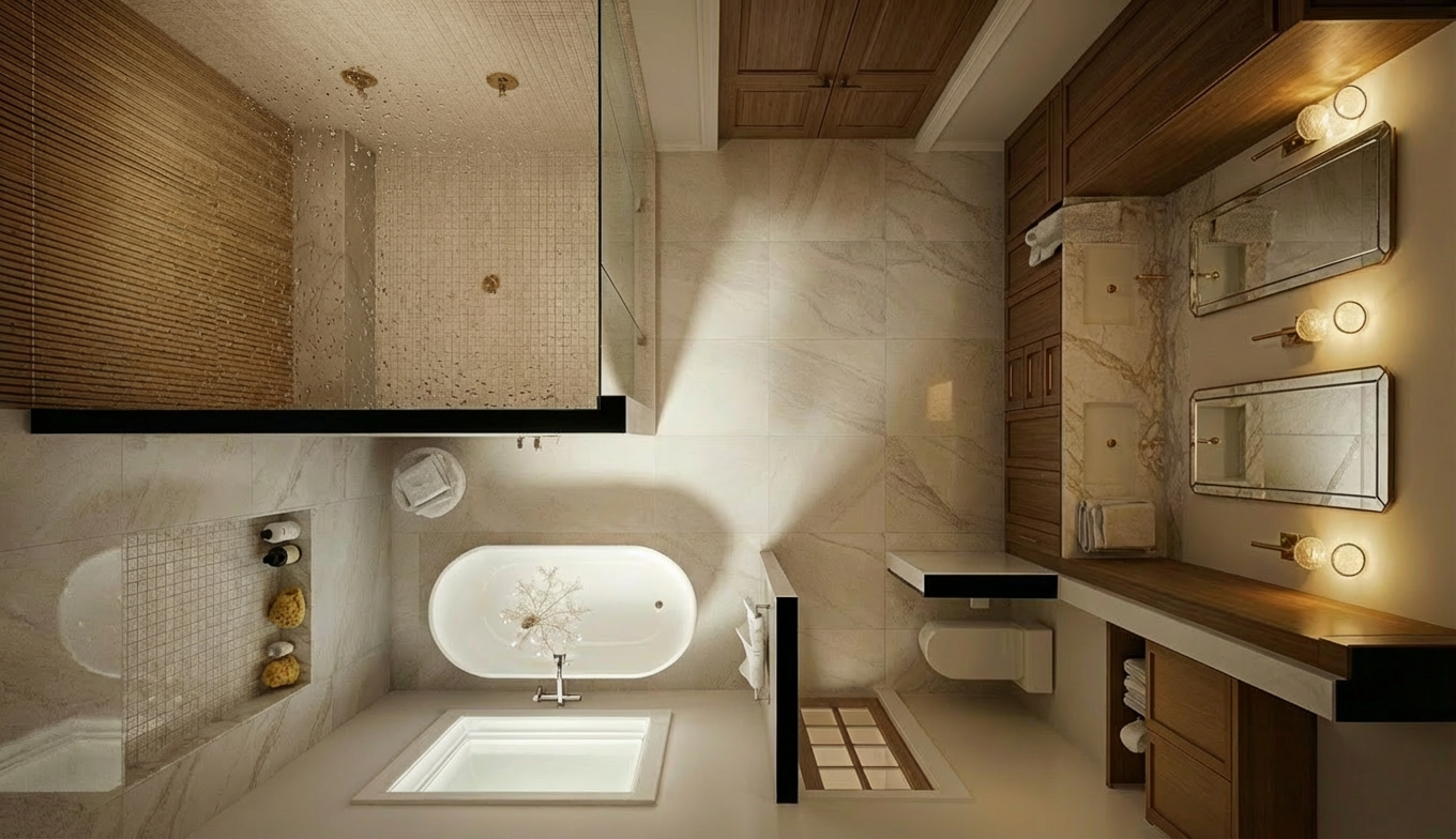 preserve the exact layout camera angle and placement of all elements do not move or redesign anything add a horizontal niche on the west wall of the shower inside the shower