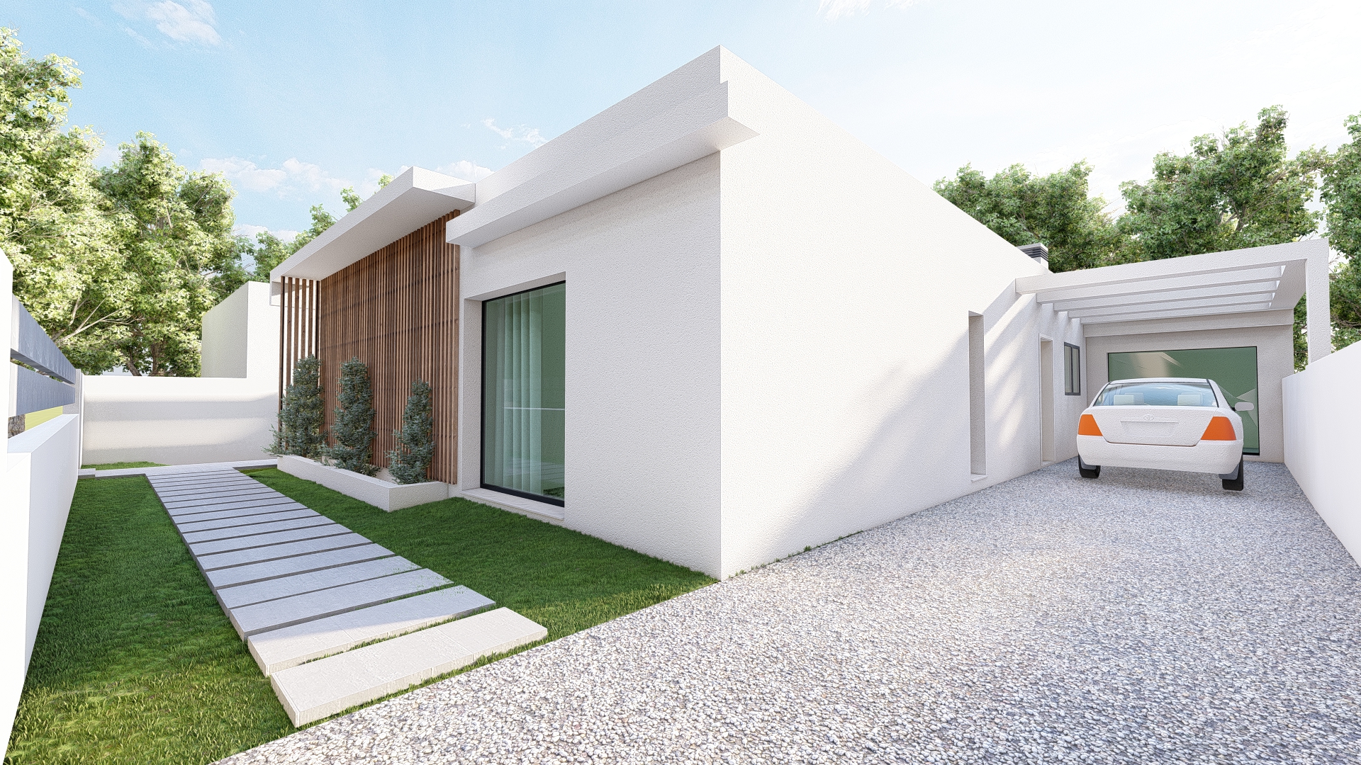 vista exterior com filtro de realismo com ilumina o natural do sol fachada podemos ver ripas de madeira e parede cor branca vegeta o e grandes janelas luz do sol reflete na janela pavimento da garagem em grelha de enrelvamento
