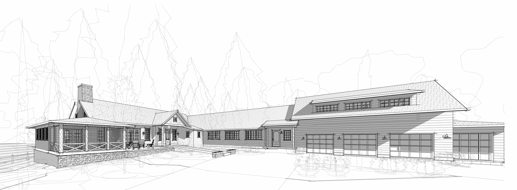 grainy watercolor render of timber frame building with reclaimed wood siding and stone wainscot watercolor trees and urban environment in the background extensive watercolor landscaping surrounding the building