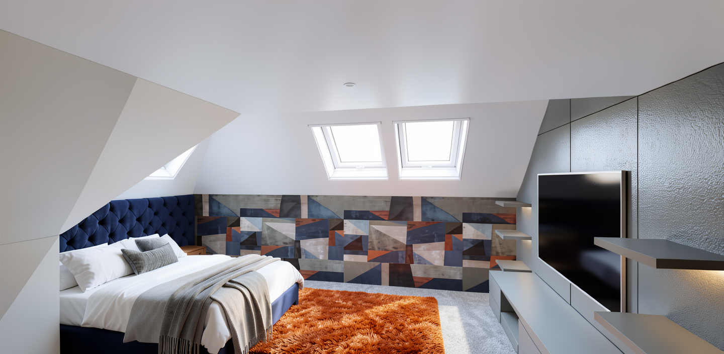 keep absolutely everything in this image exactly the same do not change anything except the rug size rug size only halve the size of the orange shaggy rug it is currently too large make it exactly half its current size in both width and length it should look like a small bedside rug a compact neat orange shaggy rug sitting only just in front of the foot of the bed approximately the width of the bed and only protruding about 300 400mm forward from the foot of the bed very small and neat keep the same burnt orange colour and same dense shaggy pile texture just make it half the size it currently is photorealistic luxury interior sharp details