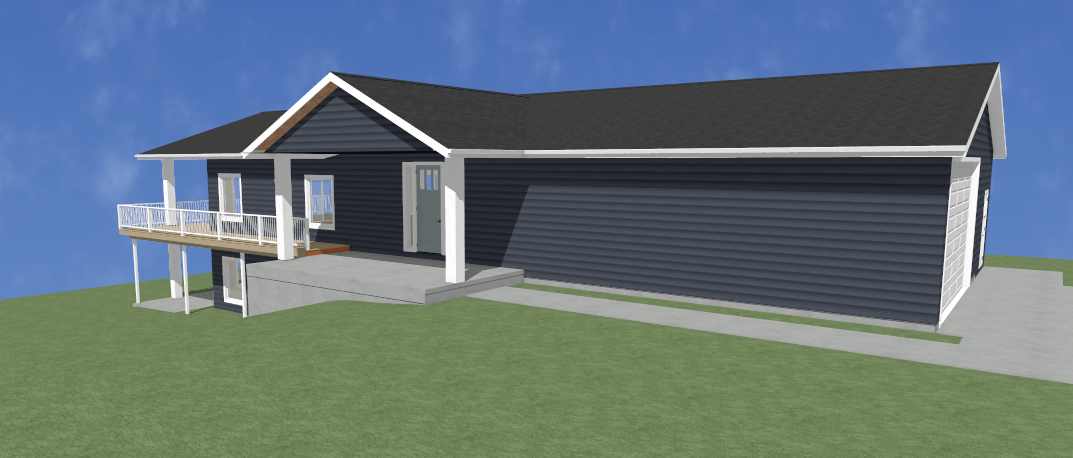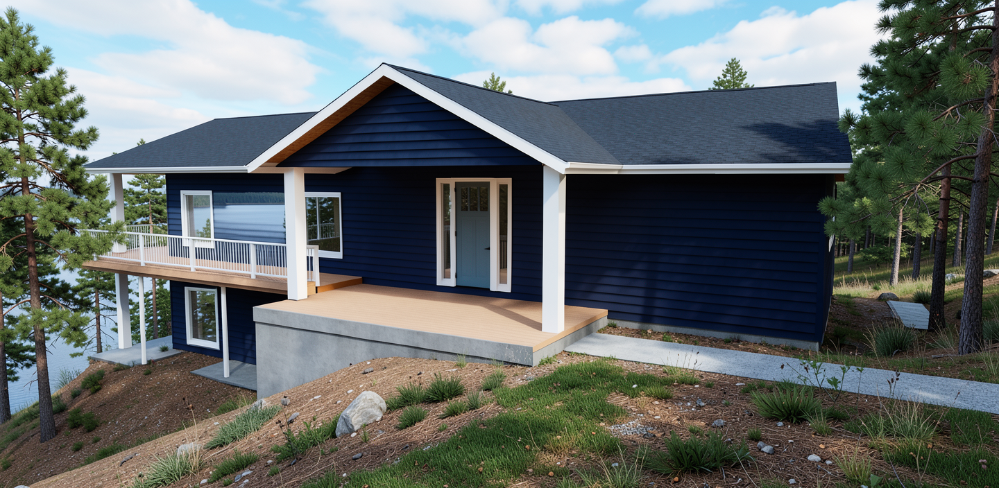 a dark navy cabin with white posts set on a slight downhill slope with pine trees scattered around it a lake behind the cabin a soft blue sky with white clouds that soften the scene a light brown deck a concrete deck below a manicured lawn with native plants a light blue front door