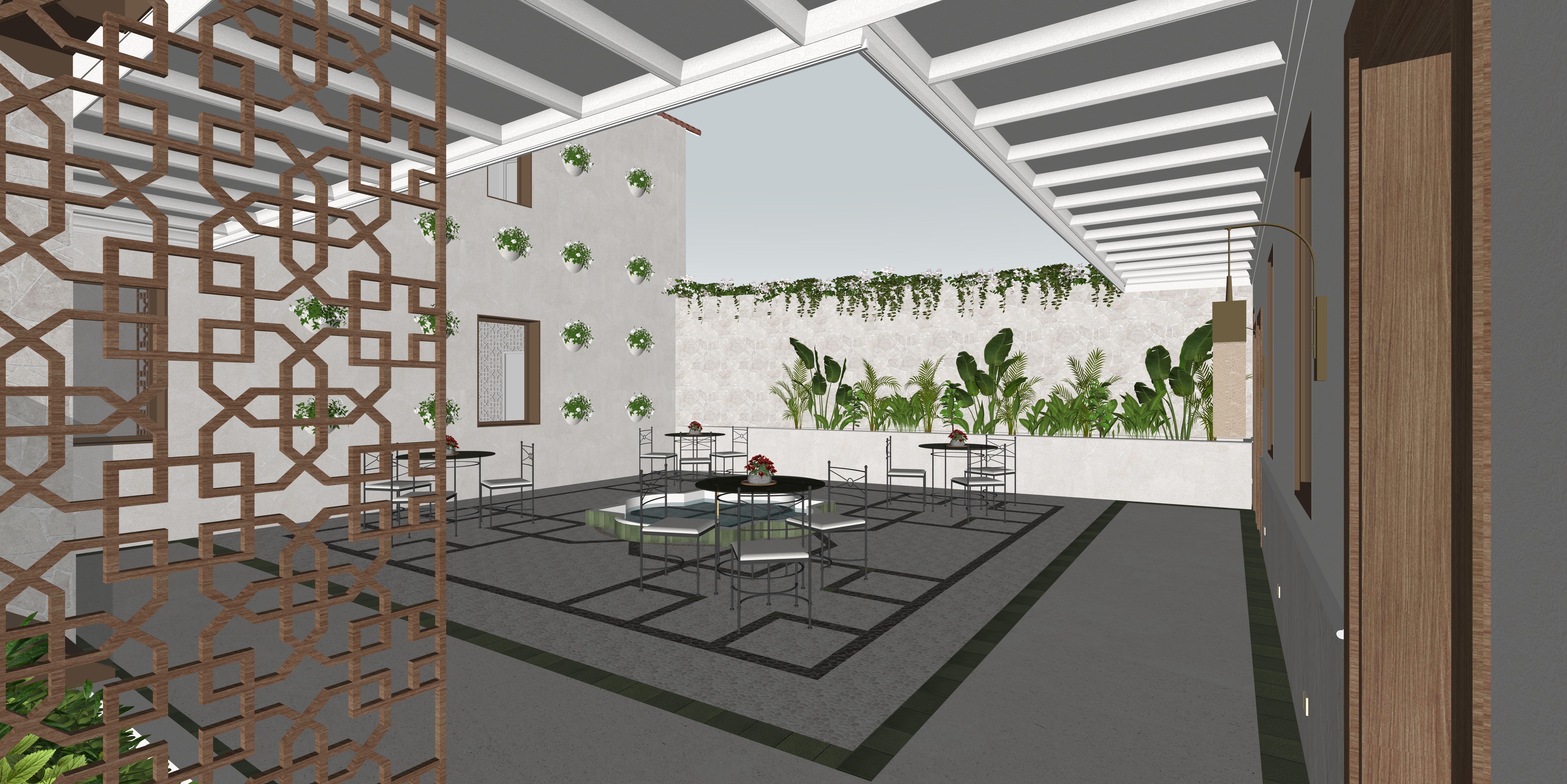 render a beautifully designed open air courtyard with a serene and modern atmosphere the courtyard should feature intricate geometric wooden partitions in rich walnut brown contrasted against smooth ivory walls adorn the walls with small potted plants lush with vibrant green leaves include sleek metal tables and chairs with dark finishes topped with vibrant red flower arrangements the ground is a blend of light and dark grey stones creating an elegant mosaic pattern the ceiling beams are a soft white reflecting natural daylight and creating a bright airy feel ivy and other greenery cascade from the higher walls enhancing the fresh and tranquil ambiance emphasize a sophisticated and peaceful environment with a subtle balance of colors and textures architecture
