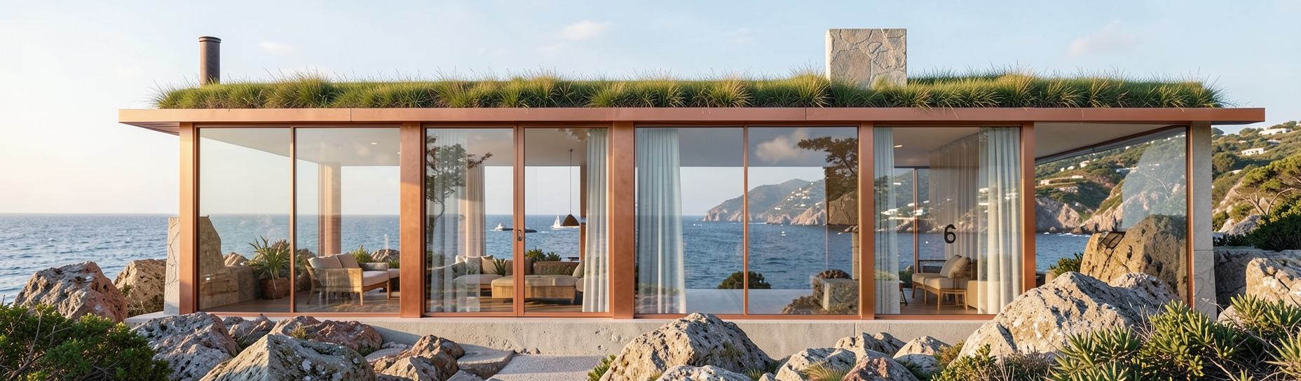 archipelago villa with rusty copper window frames and grass roof villa is by the rough nature and sea