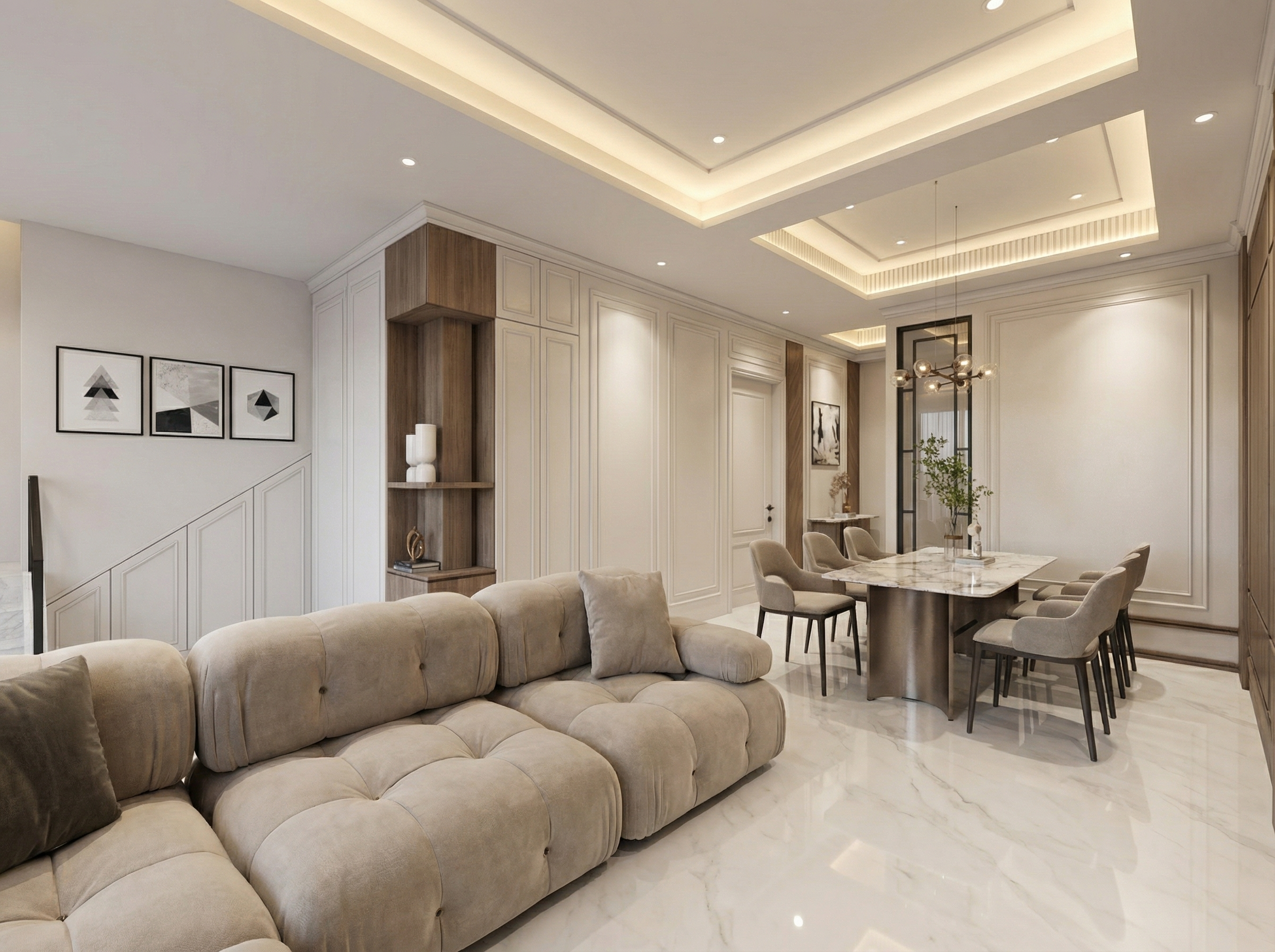 make ultra realistic image without changing any structures shapes design and materials do not change the jpeg size use soft white glossy marble texture for the floor add ceiling indirect light