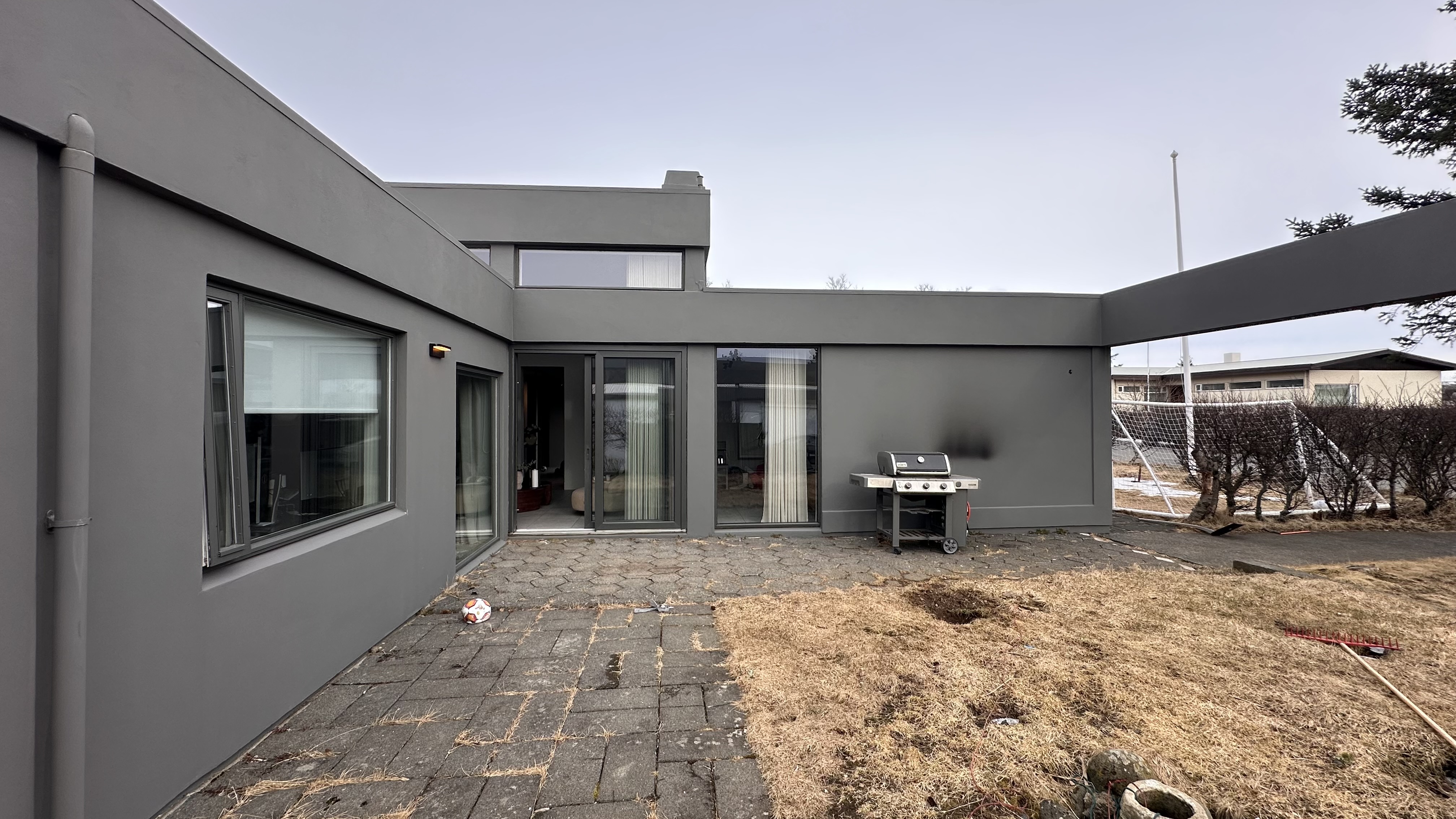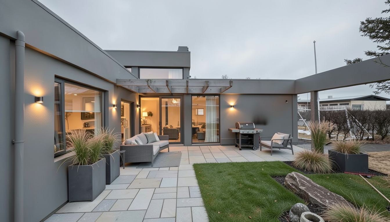 contemporary patio redesign for a flat roof modern house replace existing small pavers with large format 600x600 or 800x800 concrete or porcelain slabs introduce a clear zoning layout 1 dining area near the sliding doors 2 lounge area with built in seating 3 spa zone with recessed hot tub add a linear pergola aligned with the architecture use timber accents to soften the gray fa ade include integrated lighting strips wind screening elements and minimal planting beds with grasses maintain clean lines and orthogonal geometry