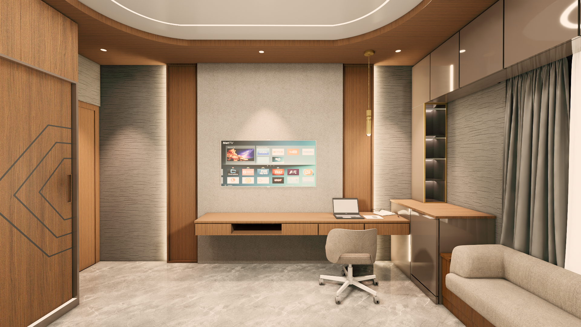 make changes in colors if required to the room with the color pallete walnut wood medium and dark grey beige and brass metal and let the room look dark but cozy and make it look realistic and don t change any elements from the image
