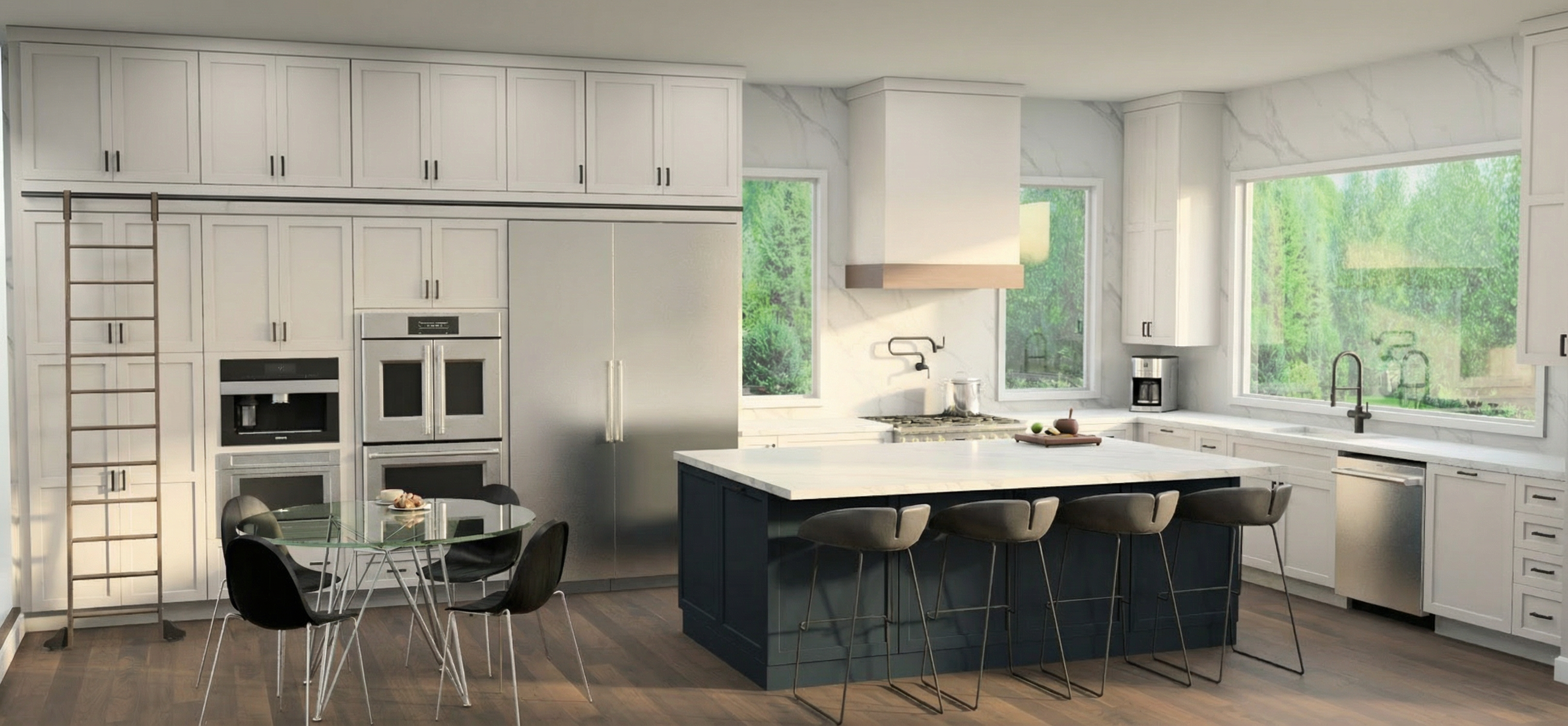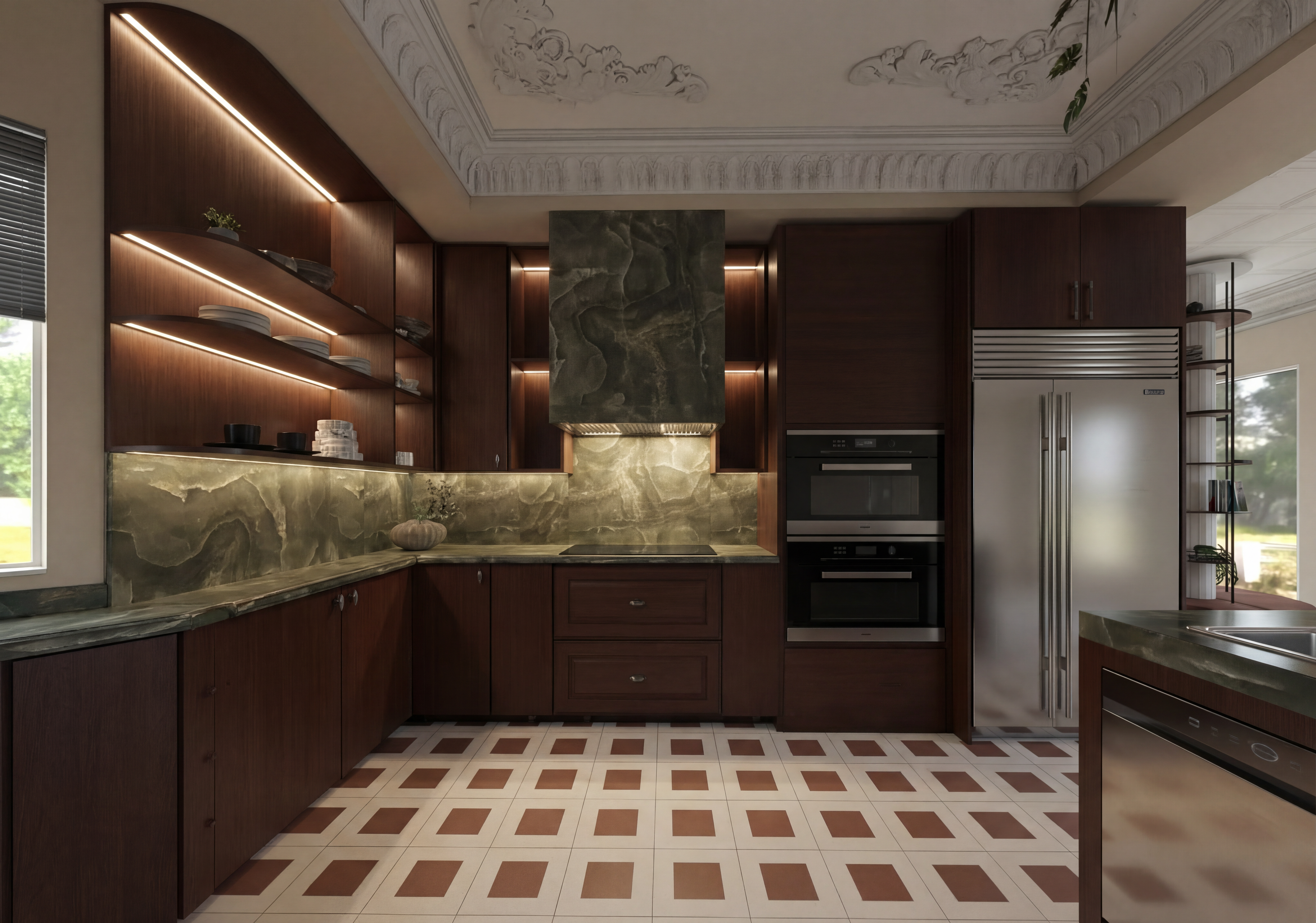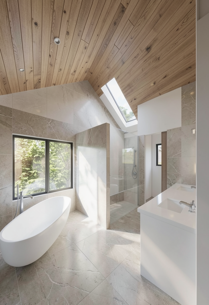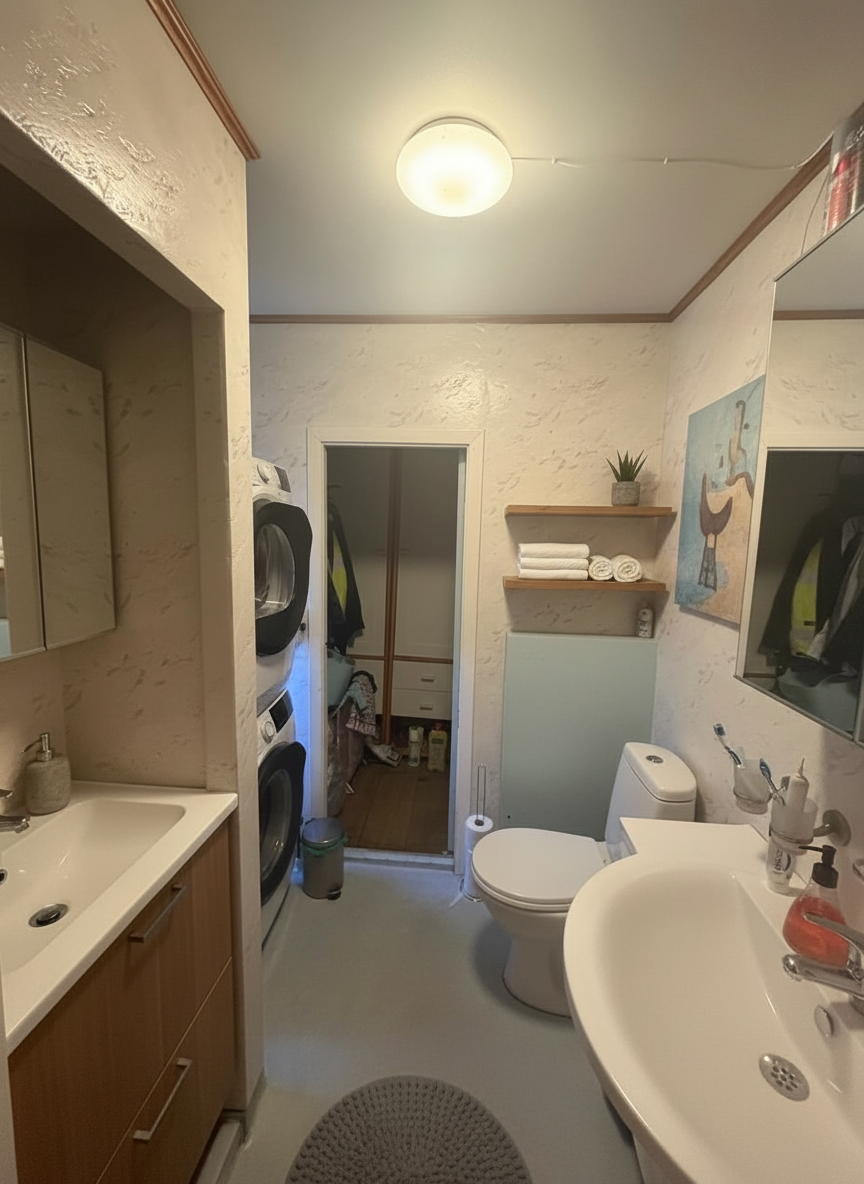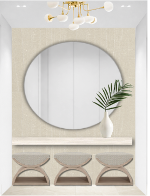 photorealistic 3d rendering of a small niche seating area camera positioned straight on centered on the round mirror architecture layout recessed niche with clean white side walls back wall finished in soft beige textured wallcovering linen grasscloth subtle vertical weave right side has a hallway opening further back the right wall before the hallway closer to camera is solid and used for artwork furniture floating console in light travertine stone honed finish visible natural pores thickness approx 2 3 inches clean rectangular form three sculptural stools underneath with curved wood bases and cream upholstered seats mirror large round mirror centered above console thin minimal frame in soft brass or neutral tone lighting modern chandelier brushed brass with white glass globes soft warm ambient lighting evenly diffused decor minimal white ceramic vase with a green branch artwork key feature on the right wall foreground before hallway 4 abstract artworks in a clean 2x2 grid frameless gallery wrap canvases no visible frame even spacing between pieces aligned cleanly size medium large so they read clearly from camera artwork style expressive abstract painterly colors green blue orange purple soft fluid transitions with some bold areas materials textures wallcovering matte woven texture travertine warm beige subtle variation and pores wood light oak upholstery soft cream fabric metal brushed brass glass opal mood warm minimal luxury calm neutral base with bold artistic moment rendering style ultra realistic soft shadows subtle reflections clean composition no clutter slight depth into hallway but focus stays on niche art