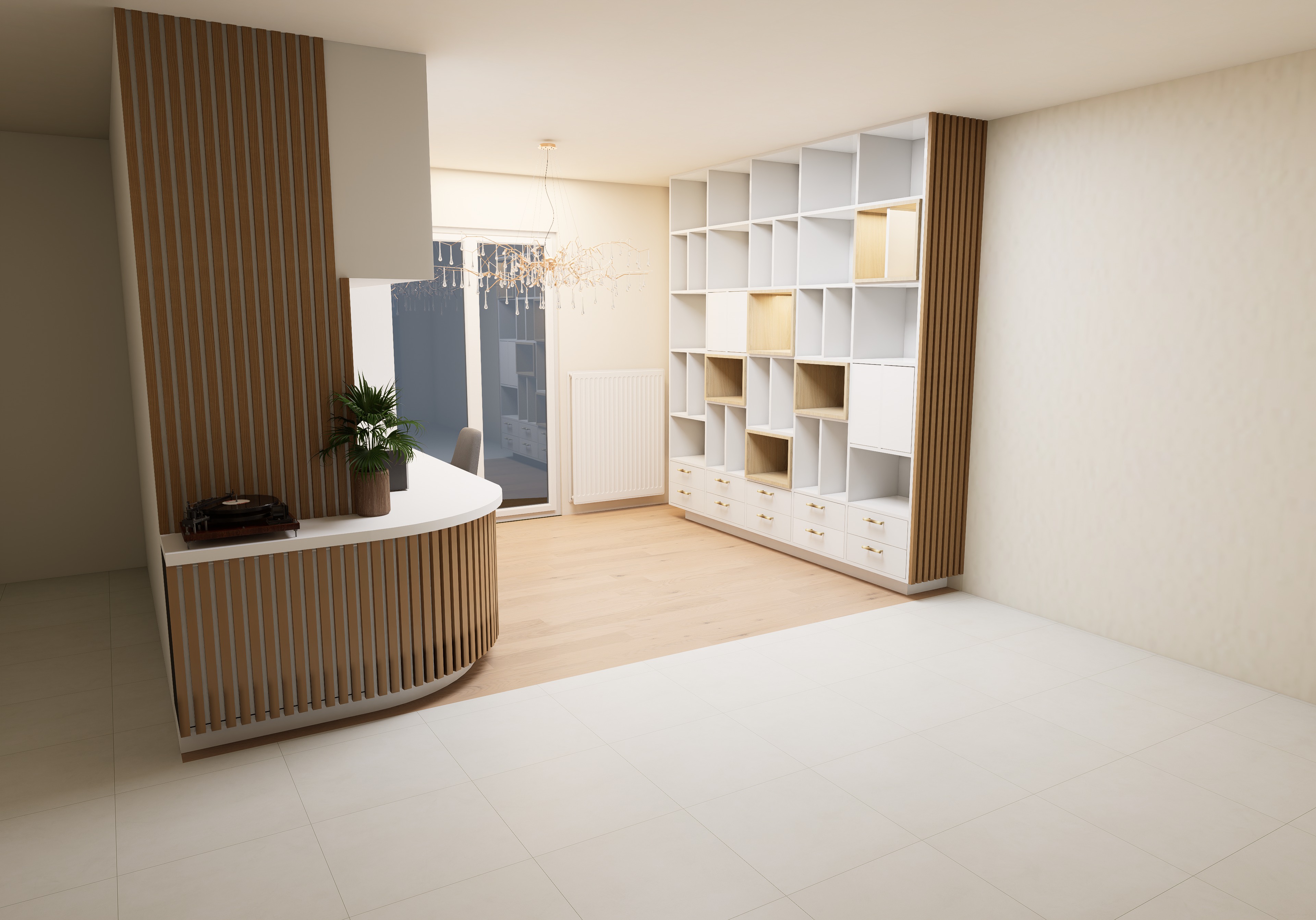 rend cette scene r aliste mais en ne modifiant pas les l ment ou l aspect de la scene joue avec les lumi res et ombre pour la rendre r aliste rempli la bibilioth que de livre vase ou autre ajoute un poele a bois a droite de la biblioth que je veux voir a travers la fenetre un petit jardin