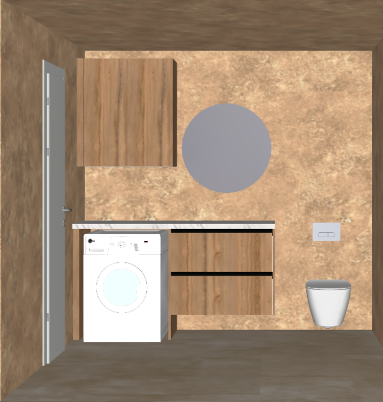 create a modern and sophisticated bathroom interior with a warm and luxurious atmosphere use natural light to enhance the space walls are a textured beige with a subtle marble pattern the wooden cabinets have a rich walnut grain the washing machine is a sleek white with a soft blue accent on the door the vanity mirror is a minimalist circular design with a silvery metallic finish floors are a dark polished stone in a deep taupe shade the ambient lighting is soft and warm casting gentle shadows for a serene and inviting feel