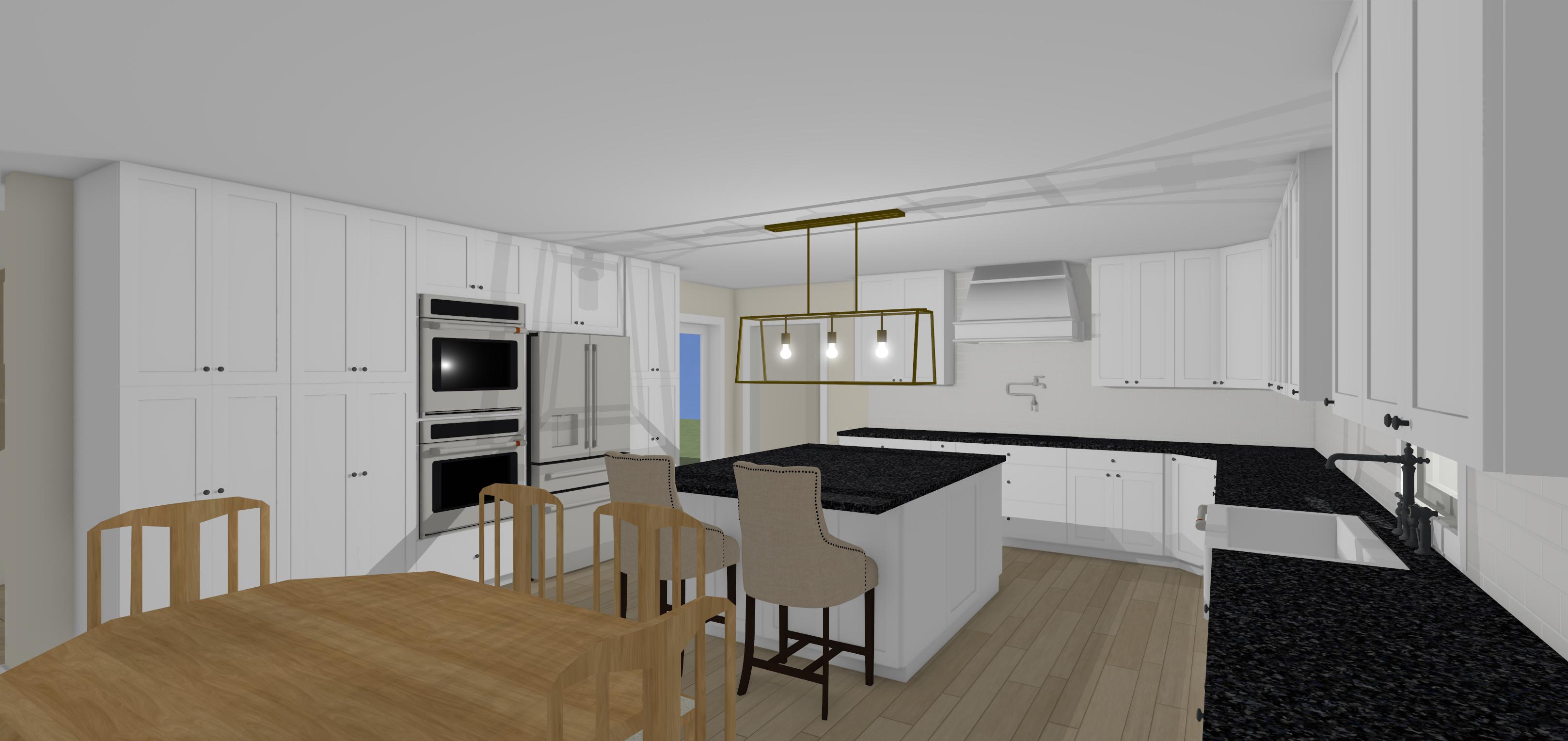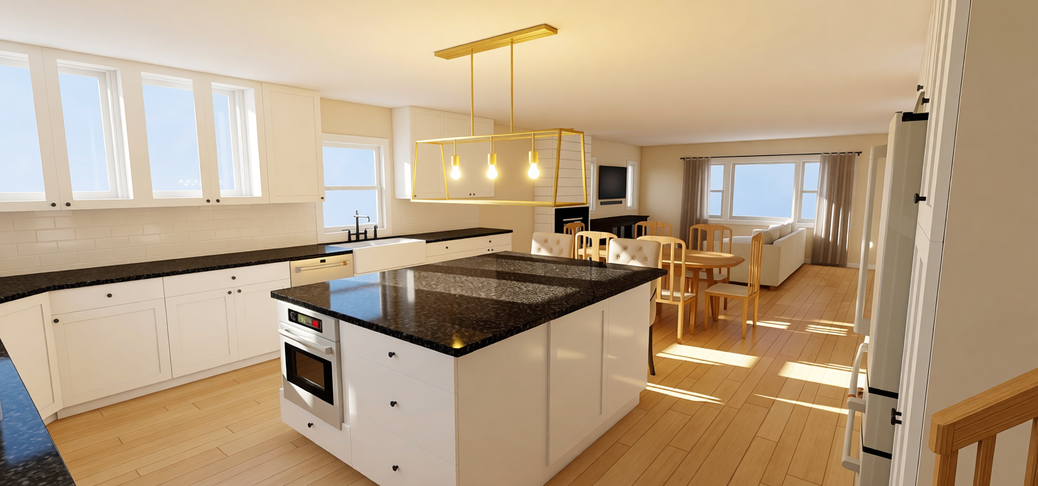 create an elegant and cozy modern kitchen interior the kitchen features sleek white cabinetry and matching modern appliances the countertops are a luxurious black granite adding contrast and sophistication the wooden dining table and chairs are a warm oak color enhancing the inviting atmosphere the hardwood floor is a soft light oak complementing the natural tones in the room the staircase is made from a similar oak wood seamlessly integrating with the flooring the pendant lights above the kitchen island emit a warm golden glow creating a welcoming ambiance the walls are painted in a soft cream enhancing the light and airy feel of the room