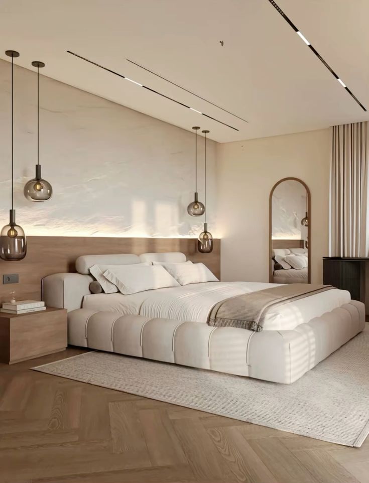 perspective shot render a modern bedroom with a calming and sophisticated atmosphere the walls and ceiling are soft dove gray complemented by a light oak wooden floor giving a warm contrast a luxurious white bedspread adorned with fluffy pillows sits atop a modern platform bed beside it a sleek white nightstand adds minimalist elegance a plush white armchair is positioned nearby providing a cozy reading nook large window draped with sheer white curtains allows natural light to flood the space on the wall introduce a large abstract painting with hues of teal navy blue and gold for a pop of color ensure the room exudes a tranquil yet stylish ambiance