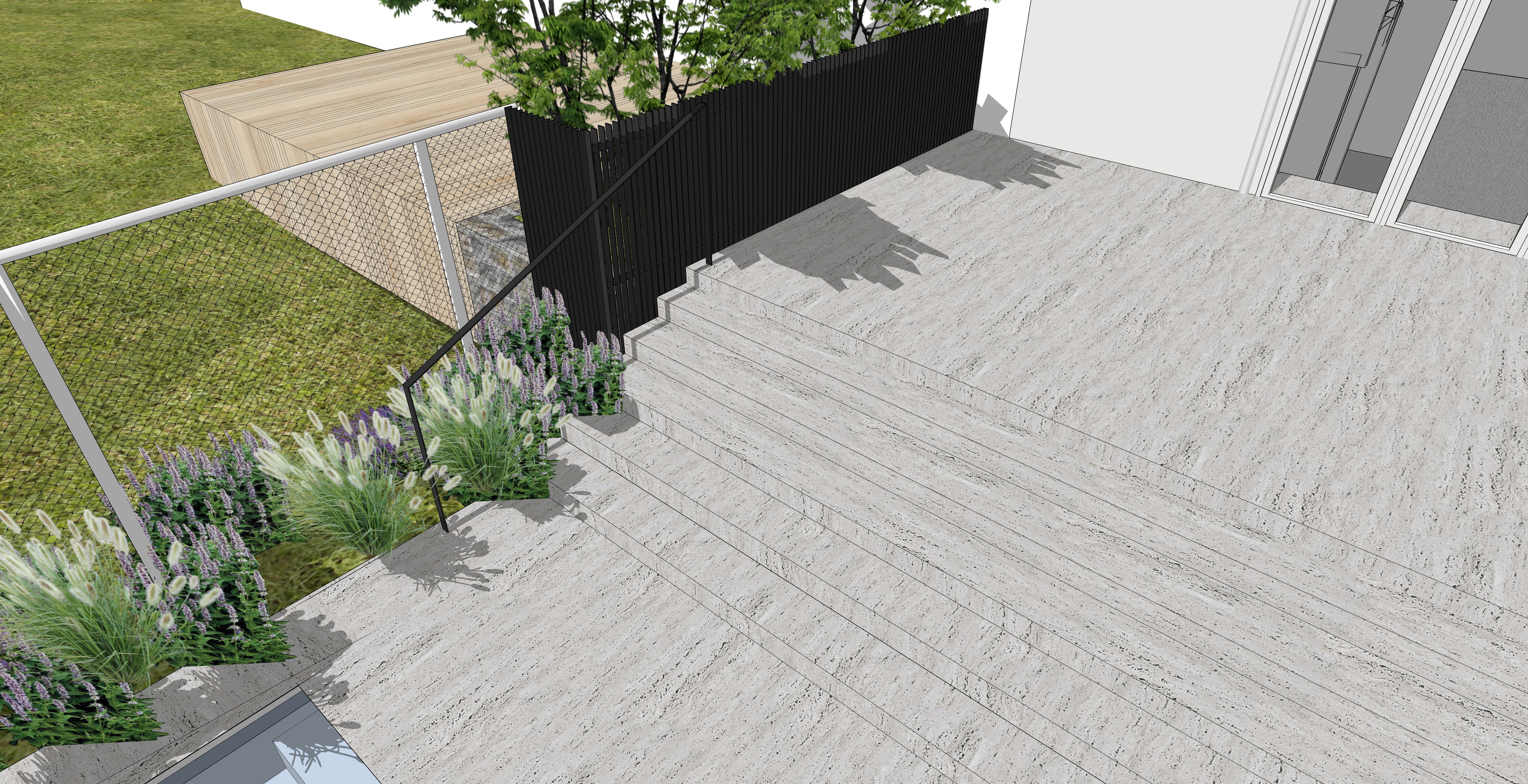 precise photorealistic visualization of the exterior of a residential house keep all materials and do not change materials on the terrace travertine