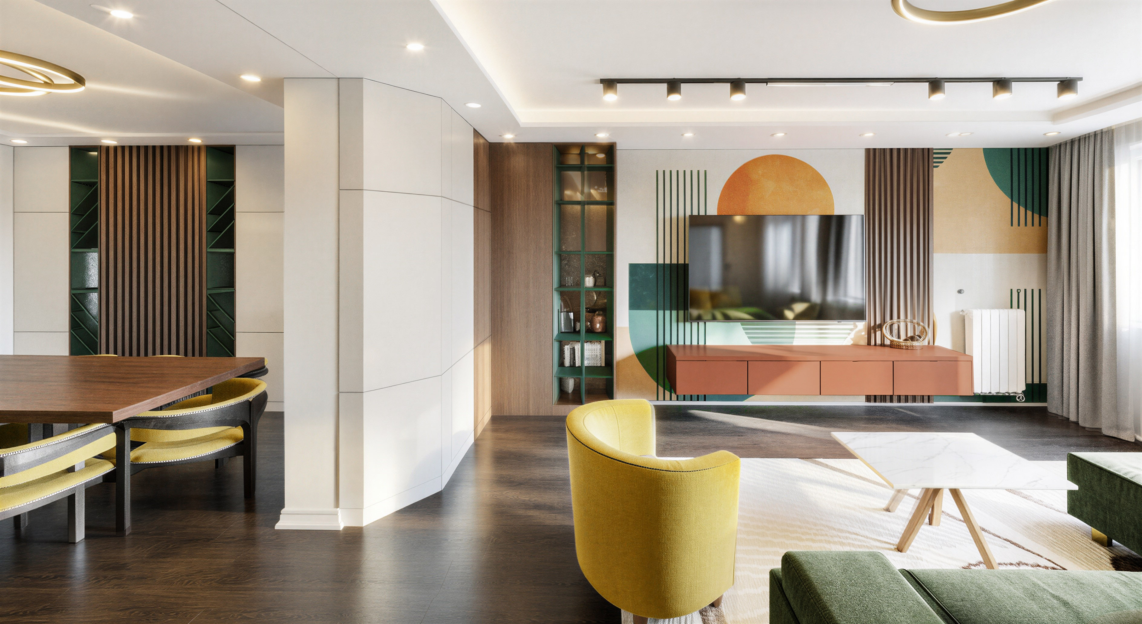 do not change the geometry and colors and materials make the curtain in the right side with color yellow musterd