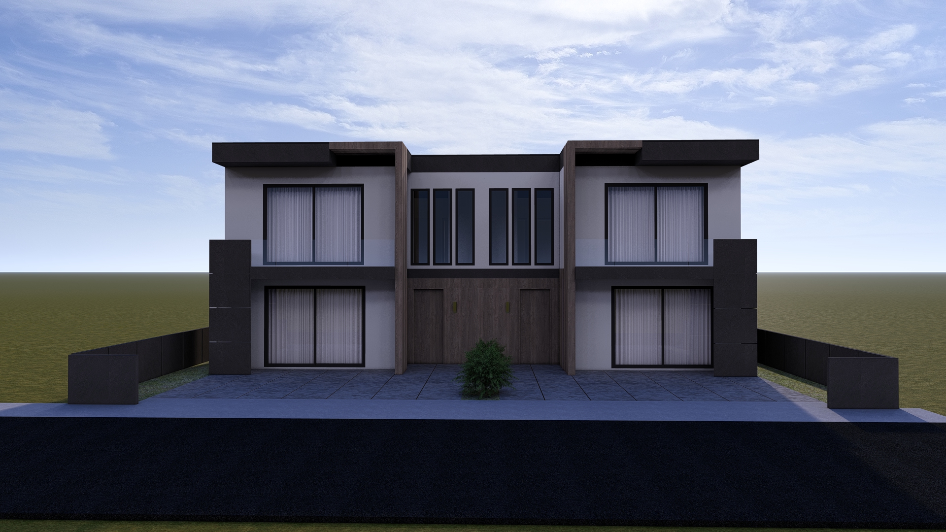 modern duplex house exterior in a real neighborhood daytime realistic lighting and proportions existing materials unchanged