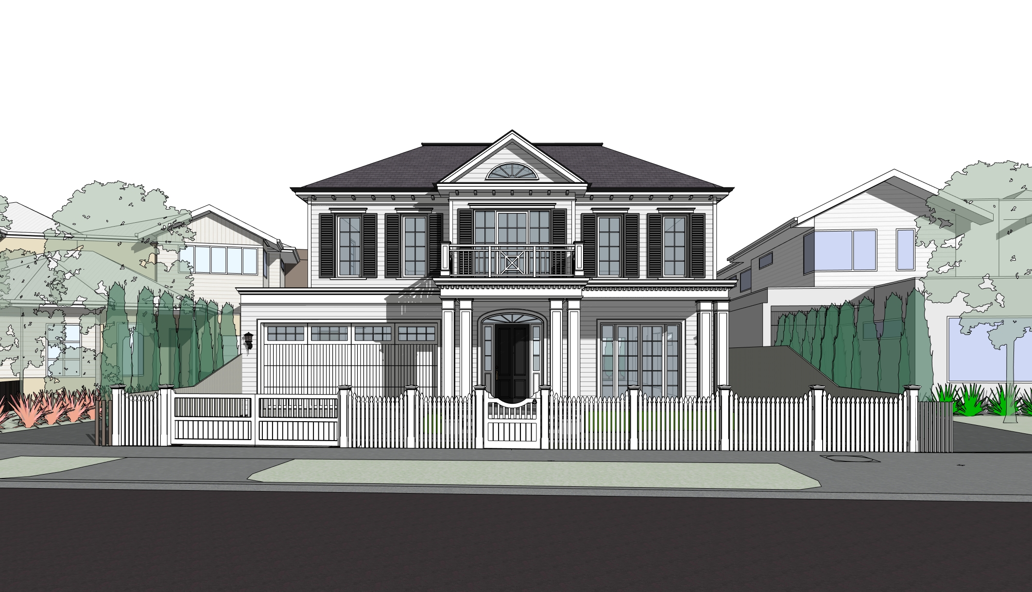 a high end residential architectural visualization of a classic american colonial style home the design features symmetrical proportions a steeply pitched gable roof with dormer windows and a welcoming front porch with square white columns style traditional colonial architecture with modern refinement clean elegant and timeless photorealistic rendering with soft natural daylight subtle shadows and a slightly warm tone to enhance materials colour palette main exterior soft warm white off white weatherboard cladding white front fence trim and detailing crisp white for fascia columns and window frames window shutters matte black for strong contrast roof dark grey slate tile with natural variation accents neutral stone and light concrete tones for driveway and pathways matte black front door white garage door landscaping lush green lawn with deep green shrubs no shrubs in front of the front fence material scheme exterior walls horizontal timber weatherboard painted smooth finish roof asphalt or timber look shingles with fine texture windows white painted timber frames with clear glazing shutters timber painted black with a matte finish porch columns painted timber or composite with a smooth satin finish base skirting subtle stone or rendered finish in light neutral tone driveway exposed aggregate concrete with a natural slightly warm tone path edging light stone kerbing with clean lines lighting environment bright daytime setting with soft sunlight from a slight angle wet road clear blue sky with minimal clouds realistic soft shadows to emphasize depth and architectural details rendering details ultra realistic textures pbr workflow high resolution output 4k or higher balanced contrast and sharpness slightly softened highlights wide angle perspective slightly eye level 3 4 view subtle depth of field for a polished professional look