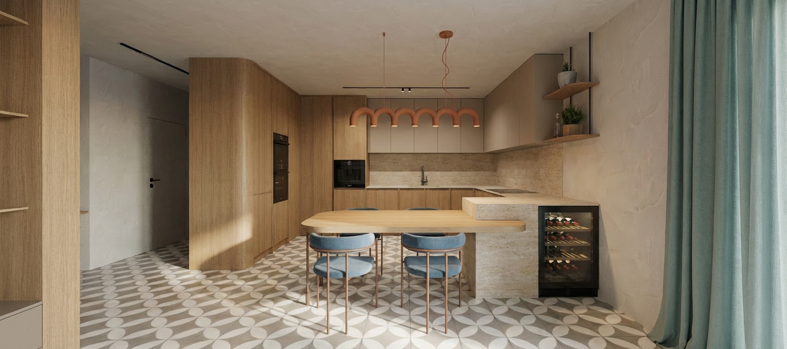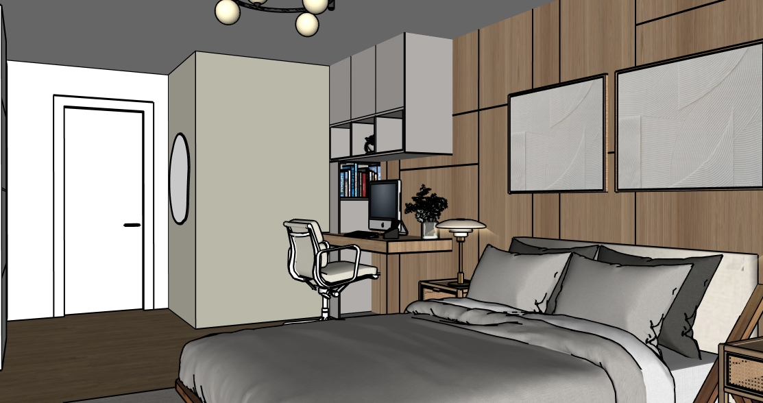 create a beautifully rendered modern bedroom with a cozy elegant atmosphere use warm neutral tones and soft lighting the bed is dressed with plush gray and white bedding walls are light beige adding warmth with a oak wood accent wall to enhance sophistication the desk is a polished wood with a sleek black computer complementing the modern white office chair shelves are white with subtle decor and books are vibrant to add color add a soft glow from a stylish desk lamp and a modern ceiling fixture the floor is rich light wood contributing to a tranquil environment enhance with soft shadows and natural lighting for a serene ambiance