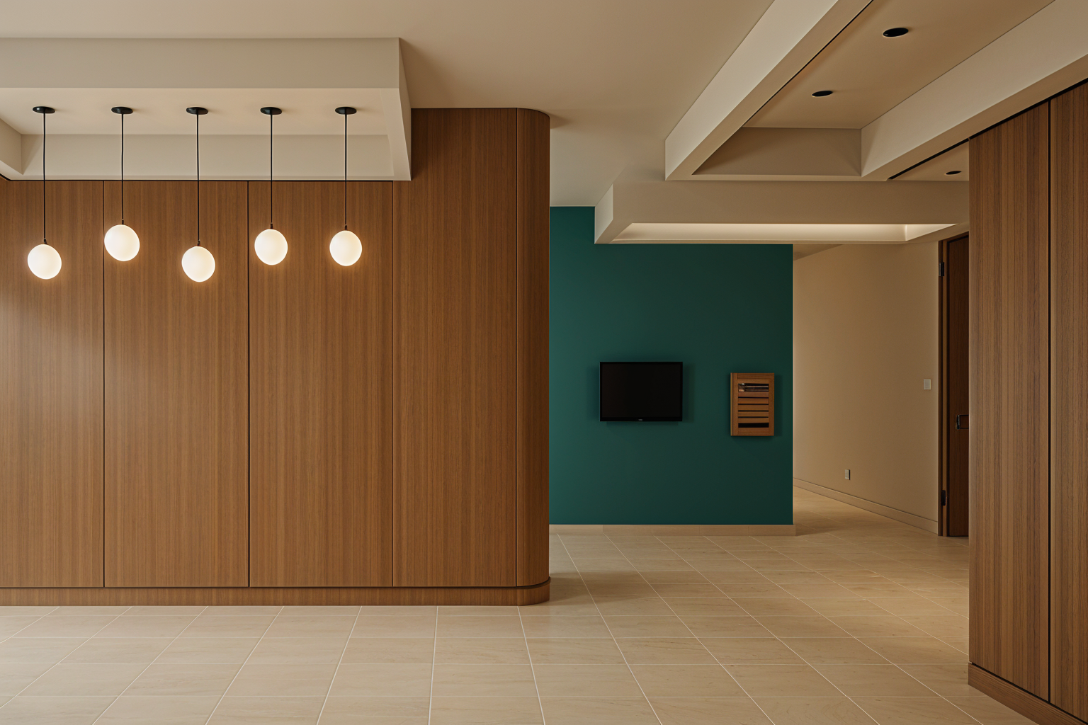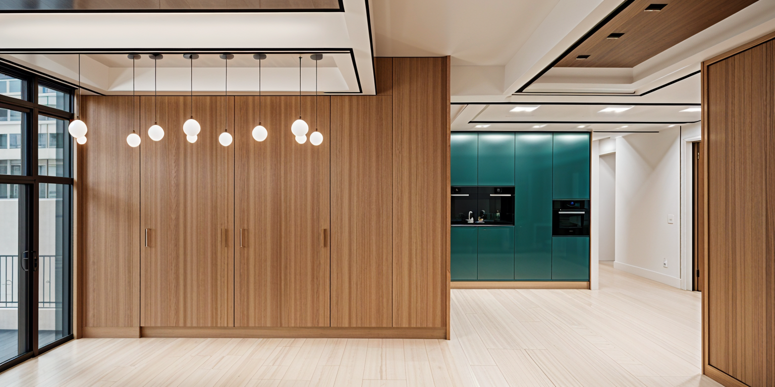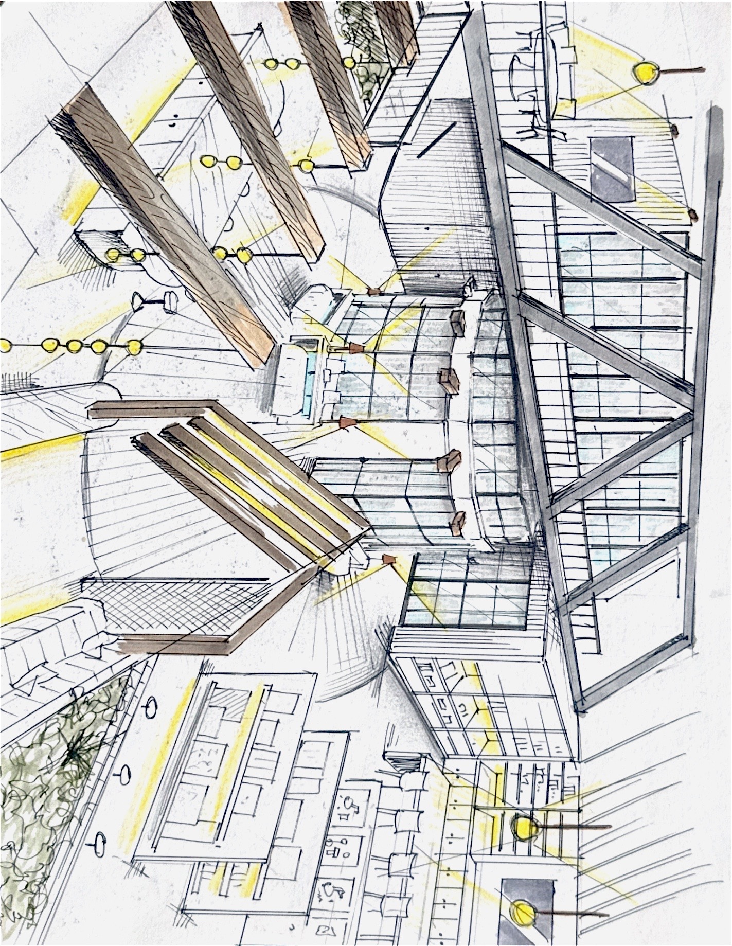 this is a rendering of a showroom space that is being built inside of an older industrial warehouse the interior walls are exposed brick that have been painted an off white color but have some aging the trellis structure is dark almost black stained wood with inset led strips lighting down into the foyer the banquette inside the trellis is upholstered in a plush neutral fabric the planter that is in the background should feature lush green plants that are partially spilling over the sides the lighting is warm in the entiree space the flooring is concrete that has been acid treated but there is a circle inset of wood flooring radiating out from a center point that is inside the glassed in conference room in the center the glassed in conference room is made of black steel shop windows that have been arranged in a circle there are beams sticking out of the wall on the lower left that have hanging globe pendants off of the ends of them architecture