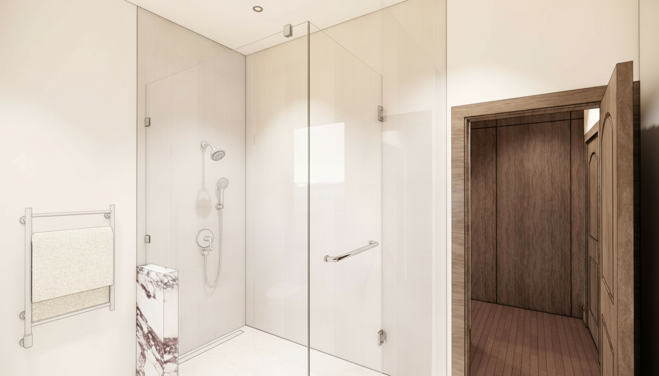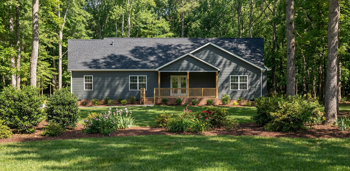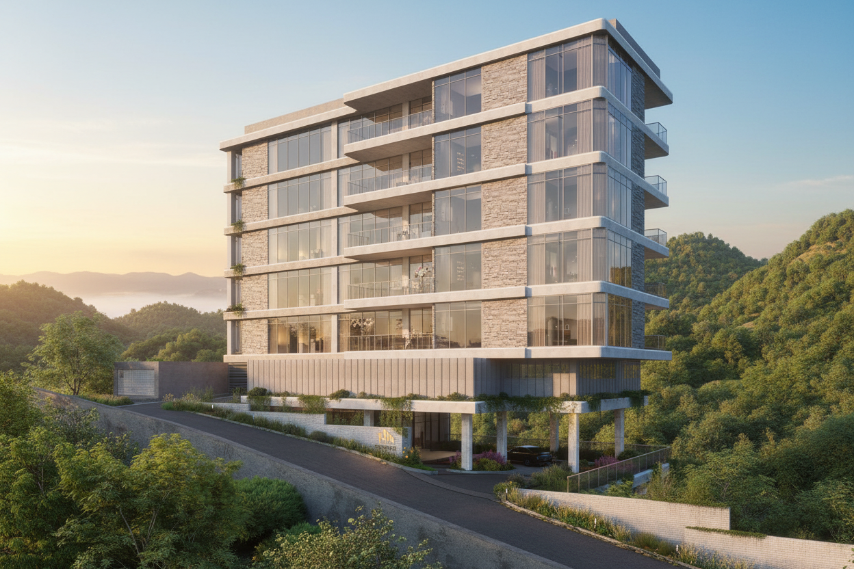 scandinavian modern minimal famhouse vibe on a slope from the back greenery around