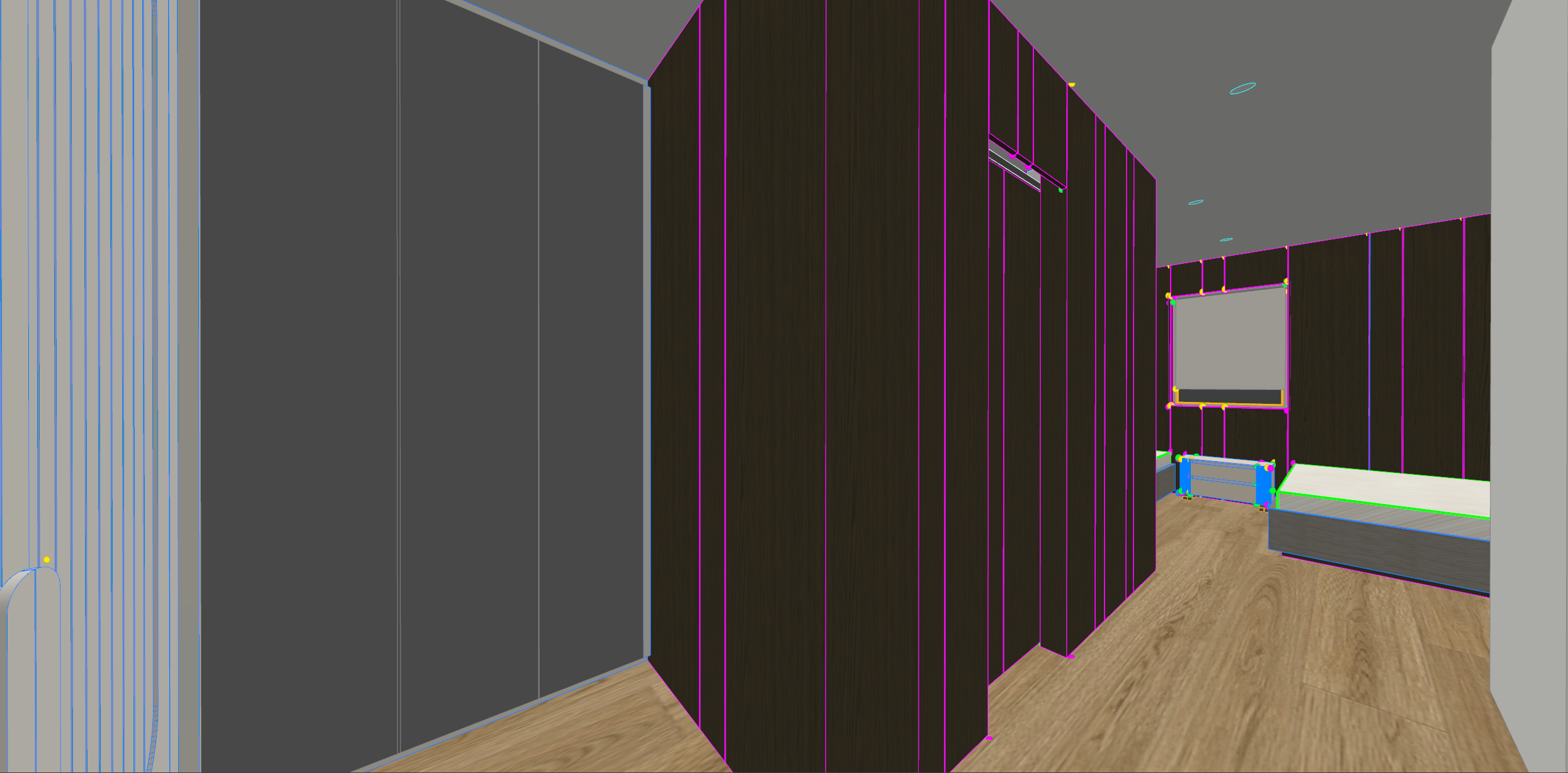 the left three doors will be flat mirrored the wood panels should be one shade lighter in color place a blanket and pillows on the bed let the over bed lights be dimmed