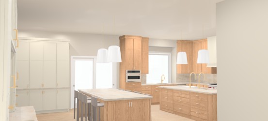 please change the color of the kitchen perimeter cabinetry to antique white keep the countertops kitchen islands windows and flooring the same color