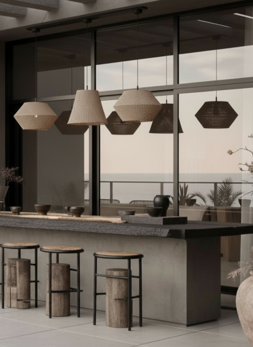 show a light grey standing seam metal roof dark grey corbels dark grey banding around windows and garage doors there are 2 dark grey bahama shutters above the entry windows the entry doors are 2 panels each and painted dark grey the garage doors are light grey the base house is smooth finish stucco painted white dark grey dappled paver sidewalk with 4 steps terraced from entry doors sweeping wide to the garage tropical landscape with blue sky and fair weather clouds