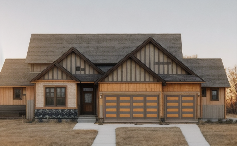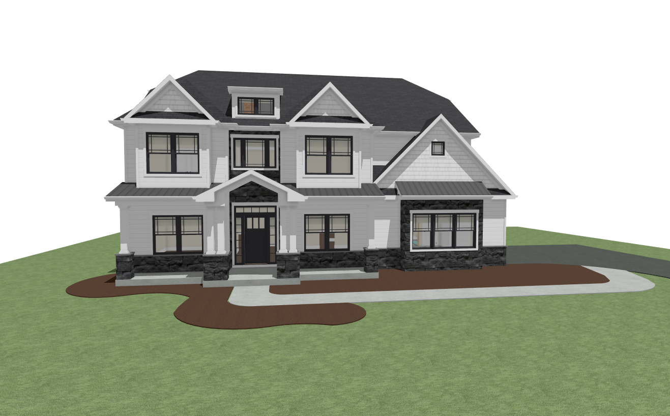 render this 3d image to appear photo realistic maintain all existing architectural materials and structural elements exactly as shown enhance the setting with a lush well maintained landscape include minimal beds manicured shrubs and a tree lined backdrop that frames the home naturally the windows should have a glossy finish with clear reflections of the surrounding trees and sky lighting should feel natural with soft shadows and realistic depth to bring the scene to life