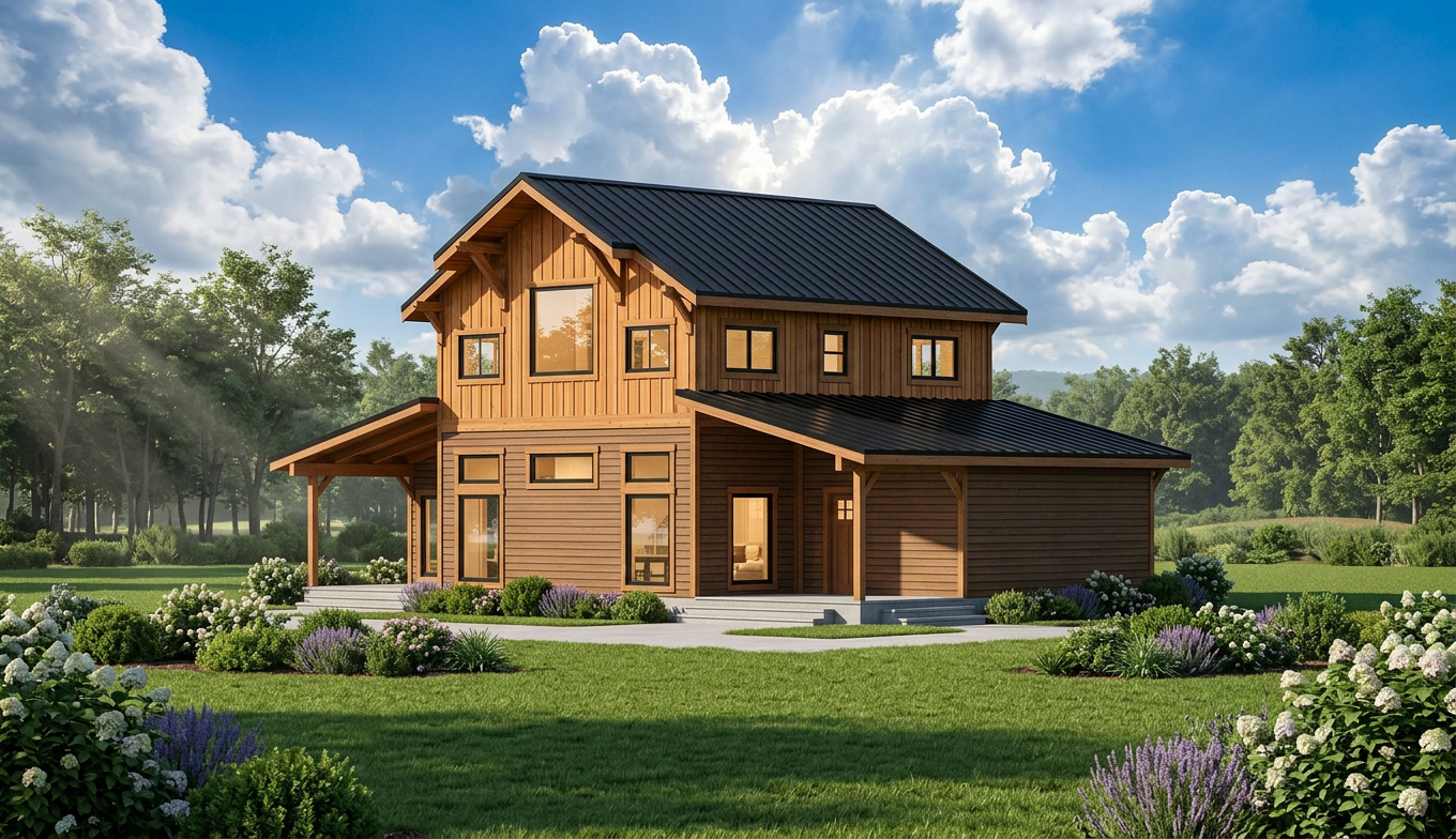 create a picturesque architectural render of lakeside lodges the lodges are timber clad in light natural wood tones the lodges have a terrace which sits on top of the lake with families enjoying the views there are low level shrubs and trees in the background to the left of the image is a cluster of colourful planting and shrubs in the middle of the lake in the foreground on the right is a family arriving and moving into the lodge and unpacking from their car in the foreground is soft colourful planting and shrubs and the sun is shining with natural light and some clouds the lake only extends to the second row of lodges there is a gravel road behind the second row of lodges