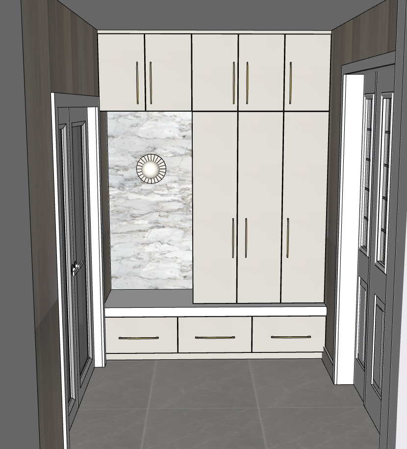 the walls and ceiling are white the doors to the left is clear glass with white doors the wood floors on walls are light white oak the floor tile is off white put light coming out of the sconce the banquette cushion that is entirely over the bottom drawers is soft white