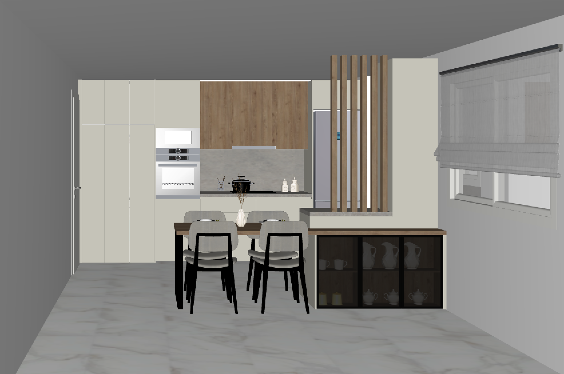 a modern kitchen and dining area with a sophisticated and elegant atmosphere the walls are a soft warm cream color the ceiling is a matte light gray providing a neutral backdrop the floor features subtle white and gray marble tiles adding a luxurious touch kitchen cabinets are a combination of minimalist white and rich light wood creating a stylish contrast the dining table is a sleek dark wood surrounded by upholstered gray chairs with black frames a decorative vase with dried plants sits on the table for a natural accent the room divider is composed of vertical wooden slats in a medium oak finish the window is covered with semi transparent gray roman blinds allowing soft natural light to fill the space creating a cozy and inviting environment