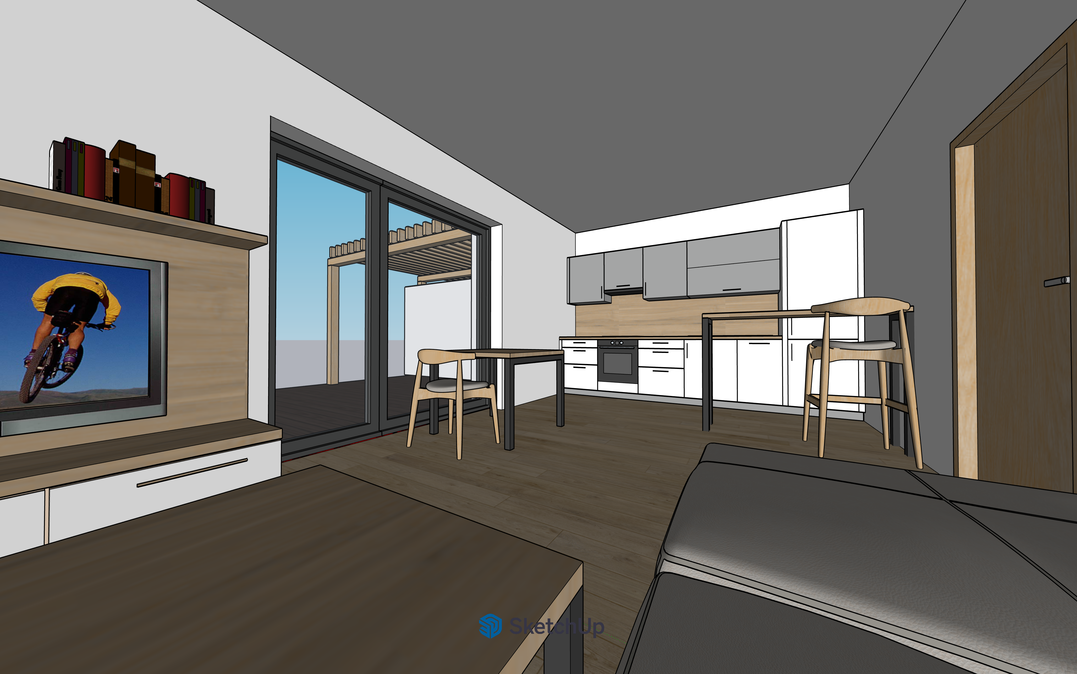 interior shot modern interi rov design otev en pokoj a kuchy stylov konferen n a minimalistick n bytek sv tl dubov s m rn m zd razn n m podlahov ch lamel velk sklen n dve e s jemn mi odlesky b l st ny a strop tepl ambientn osv tlen m kk st ny knihy na d ev n polici realistick textura kuchy s b l mi leskl mi dv ky po obou stran ch vysok ch sk n s 5 cm irokou li tou obkl d c m prvkem vedle spor ku po obou stran ch 3 z suvky naho e m lk dole hlubok horn sk ky jsou ed pln vpravo je vysok sk pro lednici s obkladov mi prvky po obou stran ch sk n vlevo od n je my ka ky 45 cm horn irok sk ka s v klopn mi dv ky nad spor kem je sk s li tovou digesto st na mezi horn a doln sk kou je oblo ena d ev nou deskou v dubov m vzoru pracovn deska ve stejn m vzoru respektuj form t obr zku pom r stran